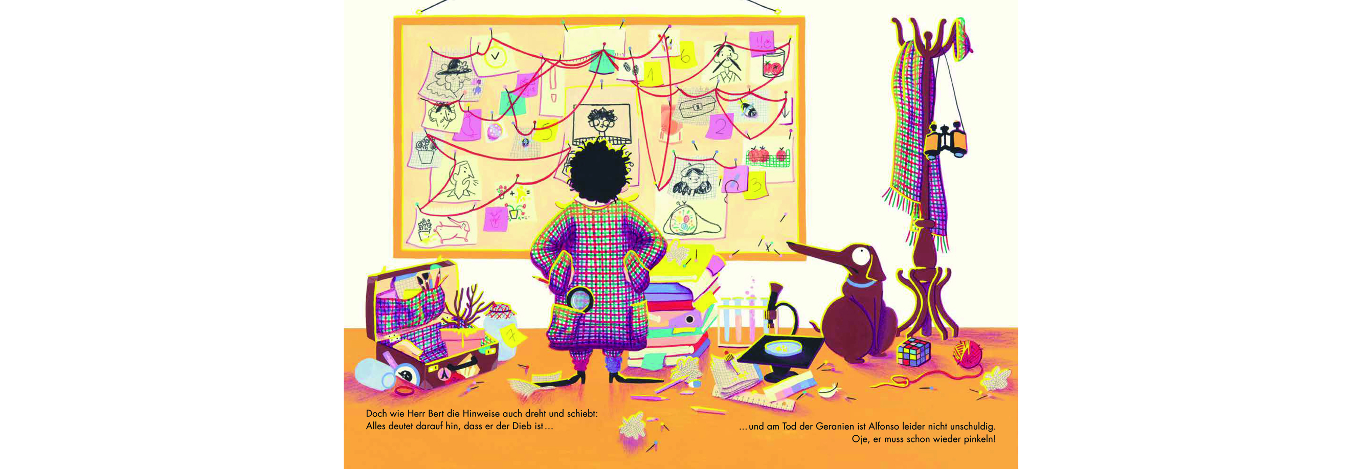 Herr Bert und sein Dackel Alfonso werden von allen übersehen. Doch als ein Dieb die kleine Stadt unsicher macht, fällt der Verdacht auf die beiden. Können sie den richtigen Dieb finden, bevor sie selbst verhaftet werden? Eine Detektivgeschichte mit einer wilden Verfolgungsjagd und ziemlich viel Knoblauchwurst.