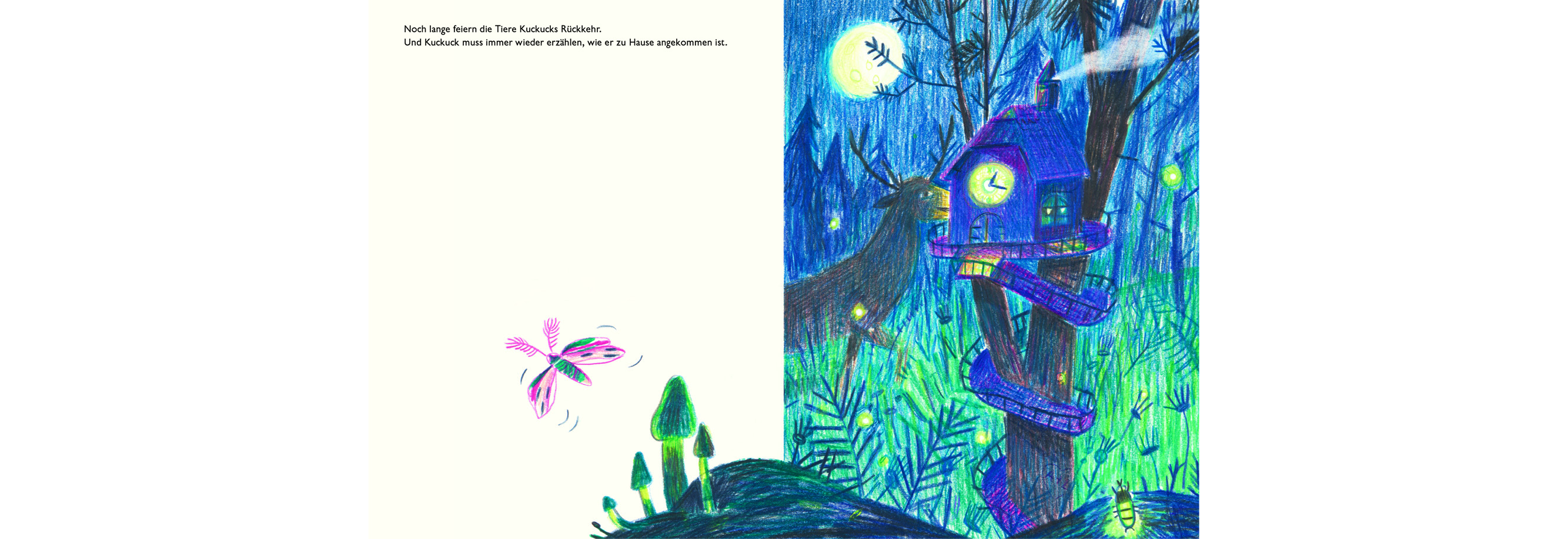Voller Vorfreude kehrt der Kuckuck im Frühling zurück in seinen Wald. Er hat seinen Freunden viel zu erzählen! Ob die Maus zu Hause ist? Nein ... Vielleicht wartet der Salamander in seiner Höhle? Nein... Oder ist wenigstens der Hirsch irgendwo zu finden? Keiner ist da, niemand erwartet den Heimkehrer. Enttäuscht fliegt der Kuckuck nach Hause. Er öffnet die Tür ... Tadaaa! - Die Freunde überraschen ihn mit einer Willkommensparty. Alle zusammen feiern bis in die Nacht hinein, und der Kuckuck erzählt nicht nur von seiner Reise, sondern auch vom Nachhausekommen.