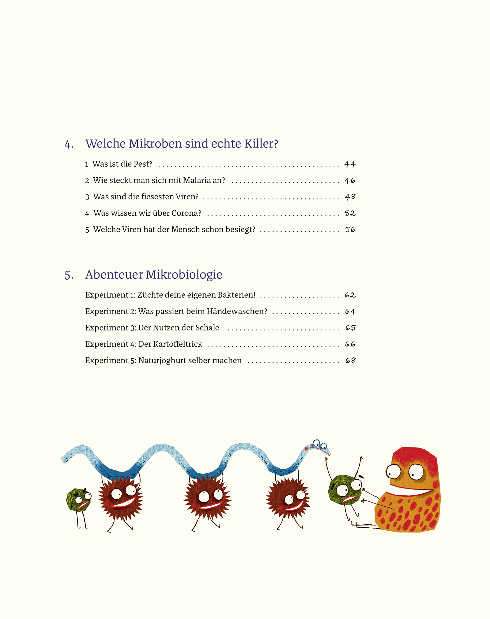 Warum müssen wir uns die Hände waschen? Wie kommt der Blauschimmel in den Käse? Und wie funktioniert eigentlich eine Impfung? Über Keime, Viren und Bakterien wird gerade viel geredet. Aber wer weiß schon, dass Mikroben die ältesten Lebewesen auf unserem Planeten sind? Oder dass neben Viren und Bakterien auch Pilze und Parasiten zur Familie der Mikroben zählen? Witzig illustriert und wissenschaftlich fundiert beantwortet "Monster-Mikroben" die häufigsten (Kinder-)Fragen rund um die kleinen, meist nützlichen, manchmal aber auch gefährlichen Organismen. Mithilfe von Wissenstests und spannenden Experimenten können die Leser selbst aktiv werden. Nachmachen ausdrücklich erwünscht, denn so kann man zum Beispiel seinen eigenen Joghurt herstellen!