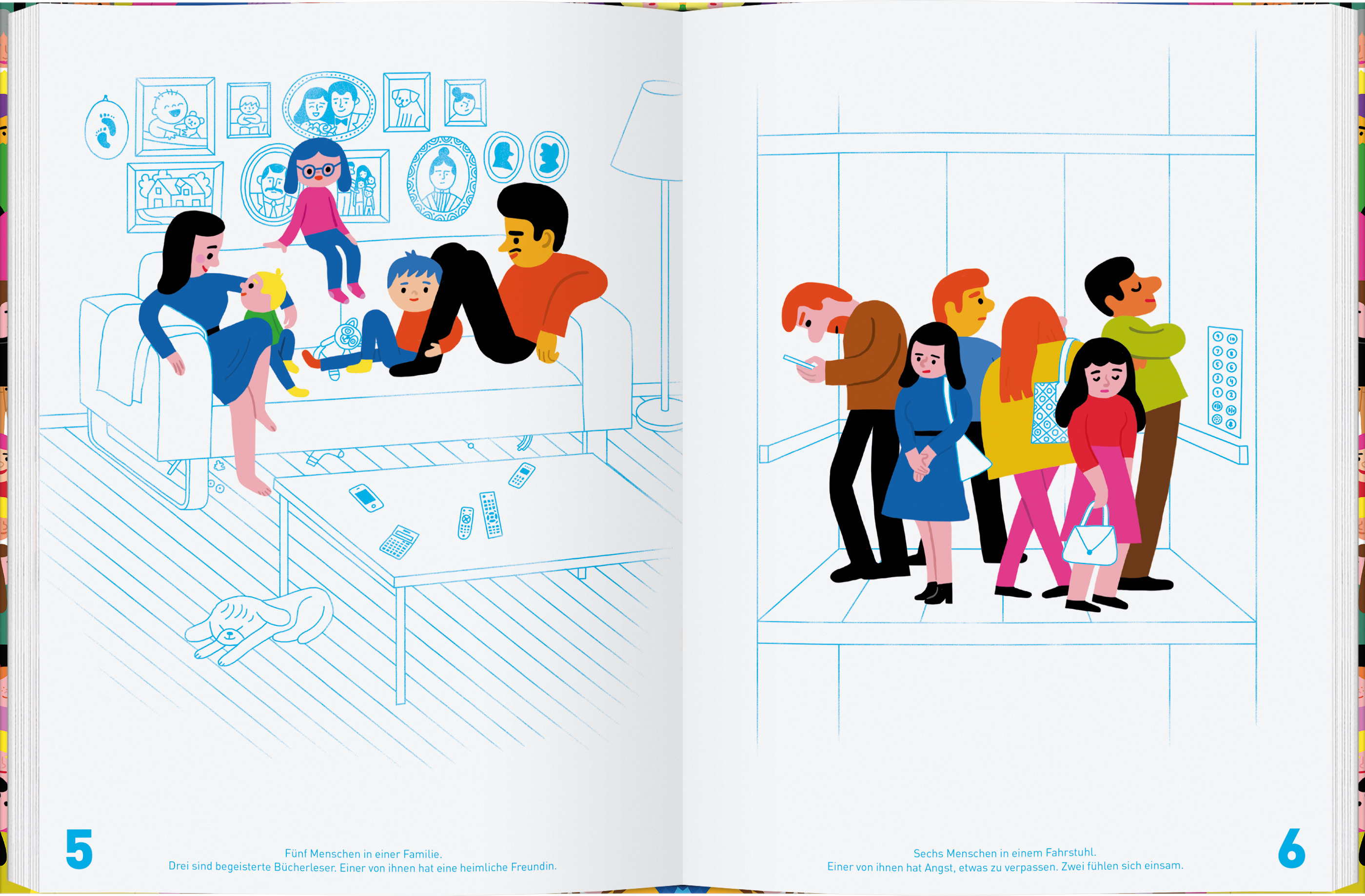 Dieses außergewöhnliche Zählbuch von 0 bis 7,5 Milliarden ist zugleich ein raffiniertes Such-, Rätsel-, Wimmel- und Geschichtenbuch, in das man sich stunden- und tagelang vertiefen kann, um die zahlreichen darin versteckten Geheimnisse zu lüften und den mannigfaltigen individuellen Geschichten zu folgen. Die farbenfrohen Illustrationen geben ein buntes und facettenreiches Bild von der Vielfalt der Menschen auf unserem Planeten.