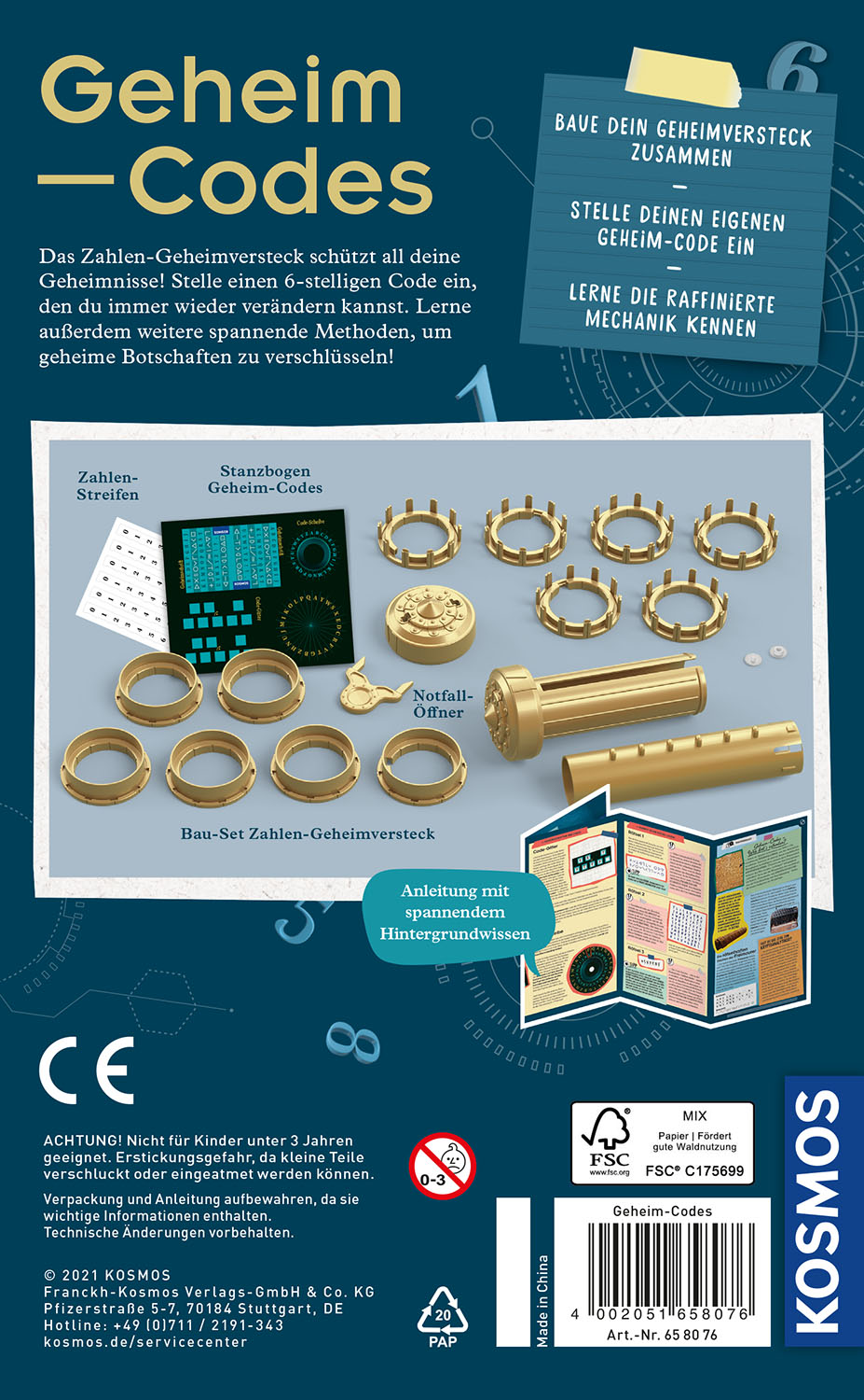 Top Secret! Im Inneren dieses Zahlen-Tresors - dem sogenannten Kryptex - bleiben Geheimnisse verborgen und nur der richtige Code gibt sie frei. Kinder bauen das Geheimversteck aus Einzelteilen zusammen und entdecken die Mechanik dahinter. Nur sie kennen am Ende den 6-stelligen Code und wissen, wie sich das Kryptex öffnen lässt! Mit der Extra-Codierscheibe weitere Verschlüsselungstechniken und Geheimschriften kennen lernen. Übersichtlich zeigt die farbige Anleitung, wie die einzelnen Kryptex-Ringe miteinander verbunden werden und erklärt, wie Verschlüsselungstechniken früher und heute funktionieren. Ein geheimnisvolles Experimentierset von KOSMOS für Detektiv-Kinder ab 8 Jahren. Knobel-Spaß und clevere Technik in einem - zum Geburtstag oder einfach nur so! Streng vertraulich! Dieses Zahlen-Geheimversteck ist der sicherste Ort im Kinderzimmer. Kinder von 8 bis 12 Jahren bauen sich mit diesem Forscher-Set ein eigenes Kryptex, das sich von keiner anderen Person knacken lässt. Die farbige Anleitung zeigt ihnen Bild für Bild, worauf sie beim Festlegen des 6-stelligen Codes achten müssen und wie sich die einzelnen Ringe des Kryptex miteinander verbinden lassen. Zahlenkombination vergessen? Keine Sorge, für diesen Fall gibt es einen Notfall-Schlüssel. Welche Geheimschriften und Codes es sonst noch gibt und wie seit Jahrtausenden geheime Botschaften ver- und entschlüsselt werden, erfahren die Kinder in den Info-Ecken der Anleitung. Geheimversteck bauen - Code einstellen - Nachrichten schützen!