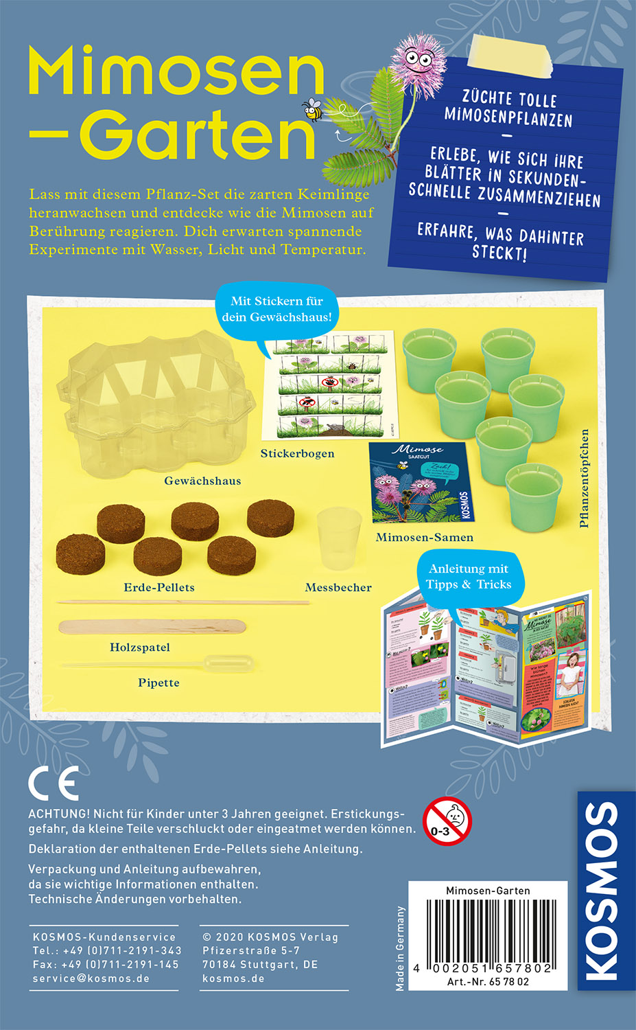 Huch! Eine Pflanze, die sich bei Berührung blitzschnell zusammenzieht! Die Mimose ist die ideale Pflanze, um mit den ersten botanischen Experimenten zu starten. Die leichte Aufzucht und die spannenden Reflexe der Blume bieten Kindern von 6 bis 10 Jahren eine Fülle an Versuchen mit Wind, Licht und Temperatur. Das mit lustigen Motiven gestaltbare Gewächshaus bietet Platz für sechs Mimosen-Töpfchen und passt perfekt auf jede Fensterbank. Ob die richtige Wasserversorgung oder Überwinterung - die Anleitung enthält viele Tipps für das optimale Züchten und Beobachten der Pflanze. Der KOSMOS Experimentierkasten Mimosen-Garten ist ein spannendes Mitbringsel und bietet Kindern erste Erfahrungen und Zucht-Erfolge im Bereich der Botanik. Huch! Eine Pflanze, die sich bei Berührung blitzschnell zusammenzieht! Was hinter dieser besonderen Reaktion der Mimose steckt, finden Kinder mit diesem kompletten Aufzuchtset heraus. Sobald die Mimosen-Samen in die Anzuchterde gegeben wurden, brauchen sie nur noch Licht und Wasser, und schon sind sie versorgt. Das Mini Gewächshaus passt auf jede Fensterbank und bietet ideale Bedingungen für das Pflegen und Beobachten der Keimlinge. Die anschauliche Anleitung beantwortet Fragen, die auch direkt an den Pflanzen getestet werden können: Was brauchen Mimosen, um zu wachsen? Warum reagieren sie so empfindlich auf Berührungen oder Temperaturen? Mit diesen und weiteren Versuchen ist das KOSMOS Experimentierset eine tolle Überraschung als kleines Geschenk oder Mitbringsel zum Kindergeburtstag.