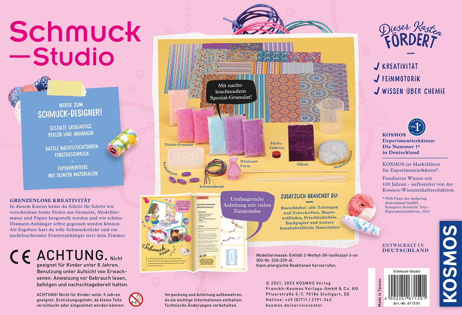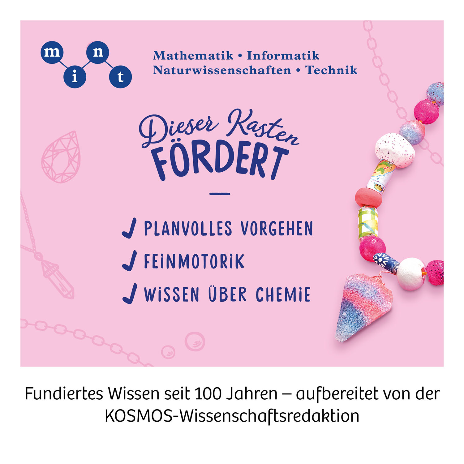 Tolle, vielfältige Perlen für wunderschöne Halsketten und Armbänder - einzigartiger Schmuck wird ganz einfach selbst gemacht. Die Perlen entstehen aus ganz unterschiedlichen Materialien: Spezial-Granulat, Modelliermasse und Papier werden zu bunten Unikaten verarbeitet. Der besondere Hingucker am Fenster: ein diamantenförmiger Anhänger, der im Dunkeln leuchtet. Magisch! Mit der Anleitung in die vielfältigen Techniken der Perlen-Herstellung eintauchen - einfache Schritte mit vielen Bildern und Tipps machen es ganz leicht möglich. Der KOSMOS Experimentierkasten ist ein umfangreiches Schmuck-Studio für ganz besondere Einzelstücke und individuelle Perlen für Kinder von 8 bis 12 Jahren. Funkelnde Diamantanhänger, zarte Ketten aus Papierperlen, ein nachtleuchtender Fensterschmuck - mit diesem umfangreichen DIY-Set von KOSMOS werden Kinder von 8 bis 12 Jahren zu kreativen Schmuckdesigner*innen. Die ausführliche Anleitung erklärt, wie sie aus einem speziellen Granulat wunderschöne große Anhänger gießen, aus Modelliermasse und Papier Perlen basteln und weitere Dinge aus dem Alltag kreativ in Schmuck verwandeln - der Fantasie sind keine Grenzen gesetzt! Mit versteckten Glückwünschen in den Papierperlen werden selbst gemachte Ketten zum ganz persönlichen Geburtstagsgeschenk. Aber wieso schmücken sich Menschen überhaupt? Dazu gibt die Anleitung Auskunft und hält spannende Details über die Geschichte des Schmucks bereit. Kreativität und Wissen in einem Set!