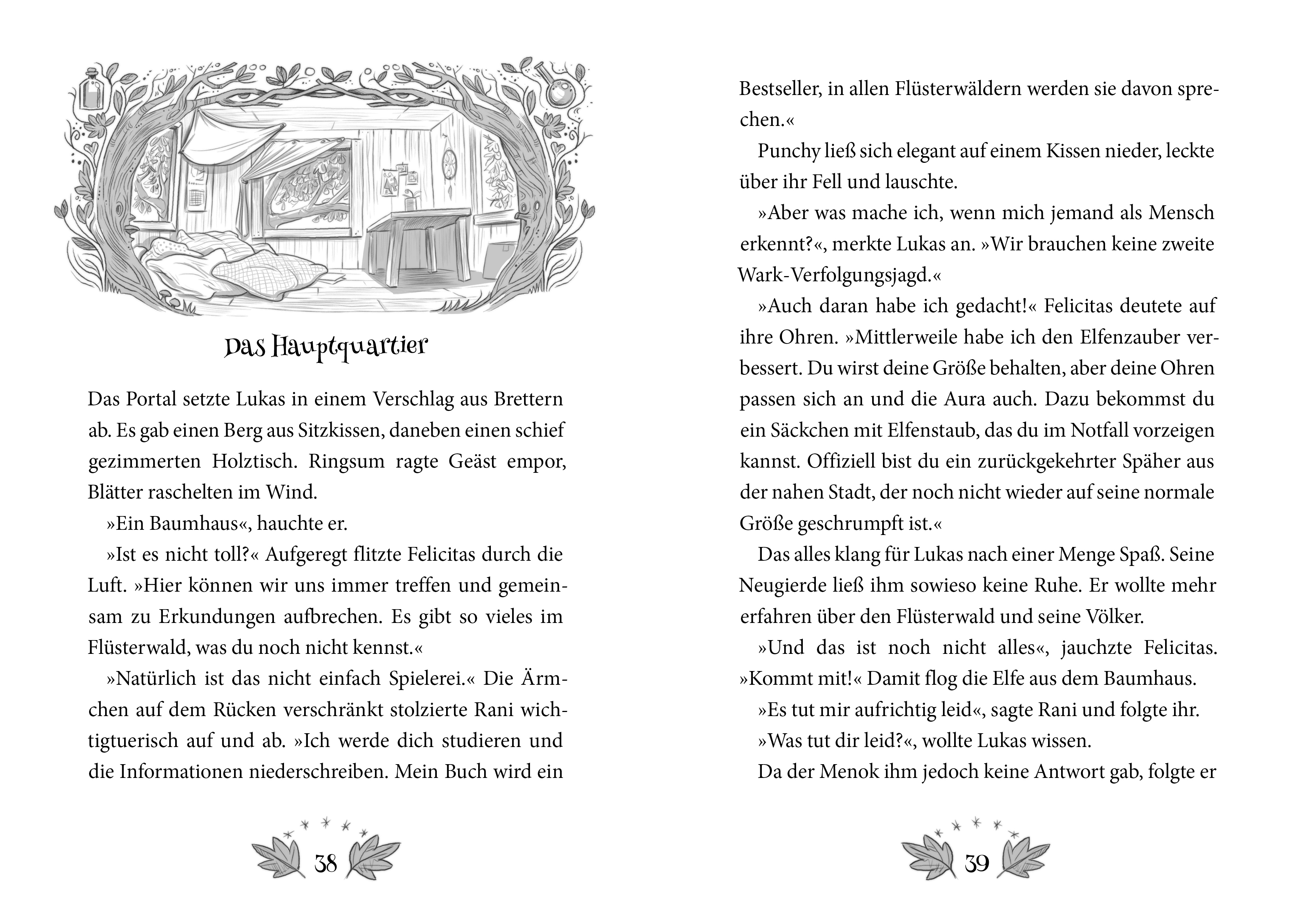 Lukas ist begeistert: Durch die Geheimtreppe in seinem Zimmer besitzt er einen Zugang zum Flüsterwald, der nachts mit den fantastischsten Wesen lebendig wird! Dort hat Lukas wundervolle neue Freunde gefunden und es passt ihm daher gar nicht, als sich ein Mädchen aus seiner Klasse beharrlich an seine Fersen hängt. Ella aber verfolgt einen eigenen Plan: Sie sucht ihren Großvater, der im Wald verschollen ist. Die einzige Spur ist ein seltsames Rätsel, das er hinterlassen hat. Lukas und seine Freunde wiligen ein, ihr zu helfen. Doch das wird gefährlicher als gedacht ...