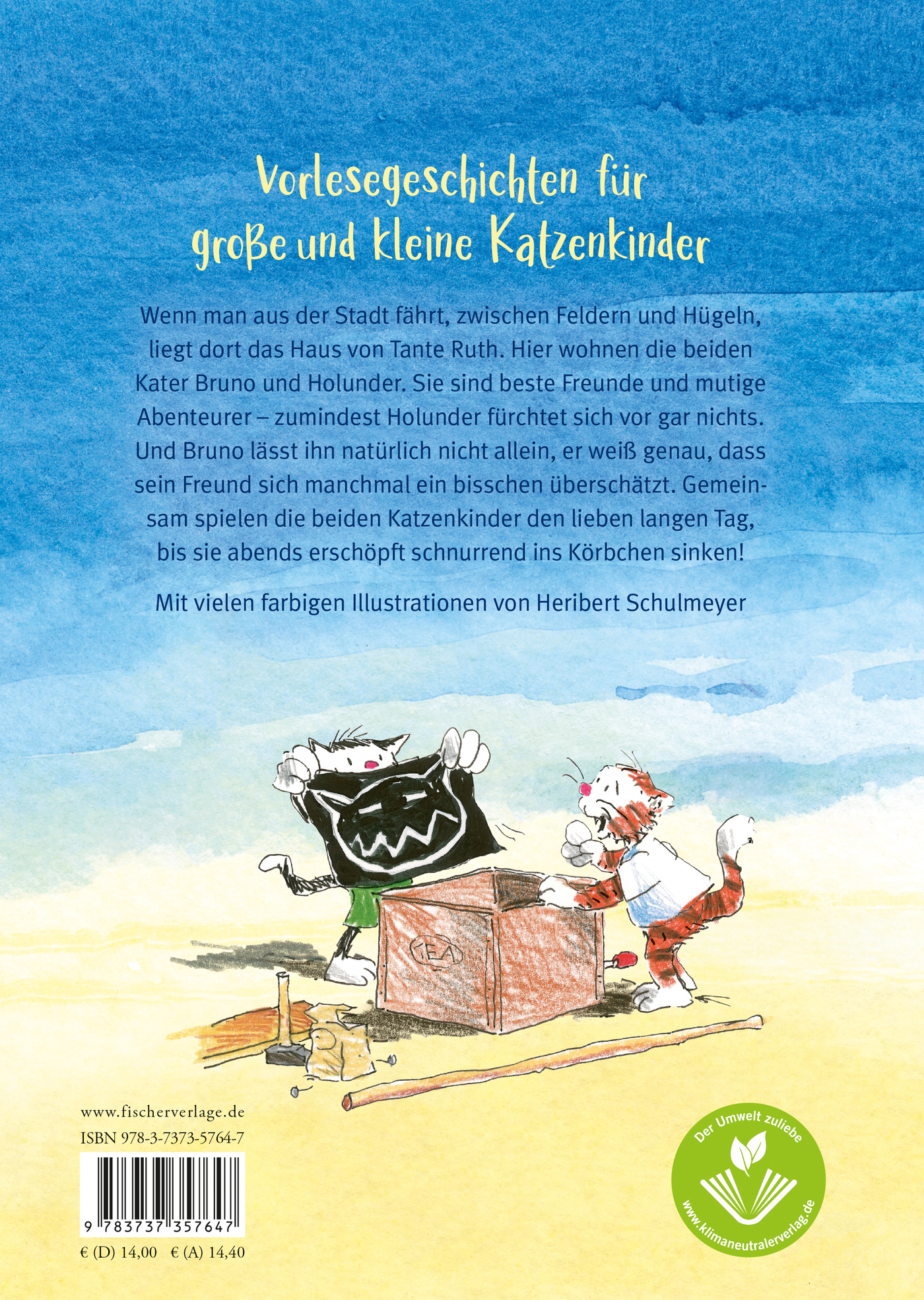 Wenn man aus der Stadt fährt, zwischen Feldern und Hügeln, liegt dort das Haus von Tante Ruth mit den grün gestrichenen Fensterläden. Hier wohnen die beiden Kater Bruno und Holunder. Sie sind beste Freunde und mutige Abenteurer - zumindest Holunder fürchtet sich vor gar nichts. Und Bruno lässt ihn natürlich nicht allein, er weiß genau, dass sein Freund sich manchmal ein bisschen überschätzt. Gemeinsam spielen die beiden Katzenkinder den lieben langen Tag, bis sie abends erschöpft ins Körbchen sinken!