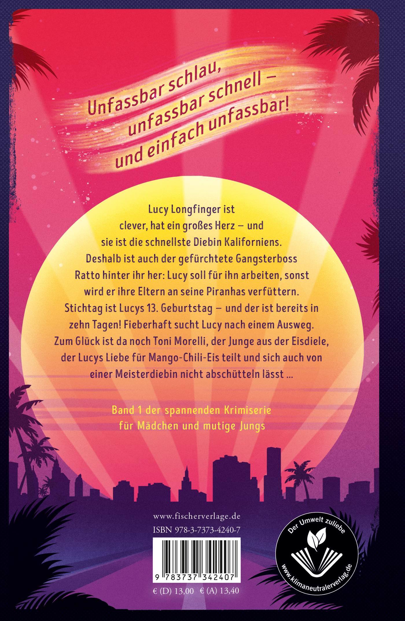 Lucy Longfinger ist clever, hat ein großes Herz – und sie ist die schnellste Diebin Kaliforniens. Deshalb ist auch der gefürchtete Gangsterboss Ratto hinter ihr her: Lucy soll für ihn arbeiten, sonst wird er ihre Eltern an seine Piranhas verfüttern. Stichtag ist Lucys 13. Geburtstag – und der ist bereits in zehn Tagen! Fieberhaft sucht Lucy nach einem Ausweg. Zum Glück ist da noch Toni Morelli, der Junge aus der Eisdiele, der Lucys Liebe für Mango-Chili-Eis teilt und sich auch von einer Meisterdiebin nicht abschütteln lässt …