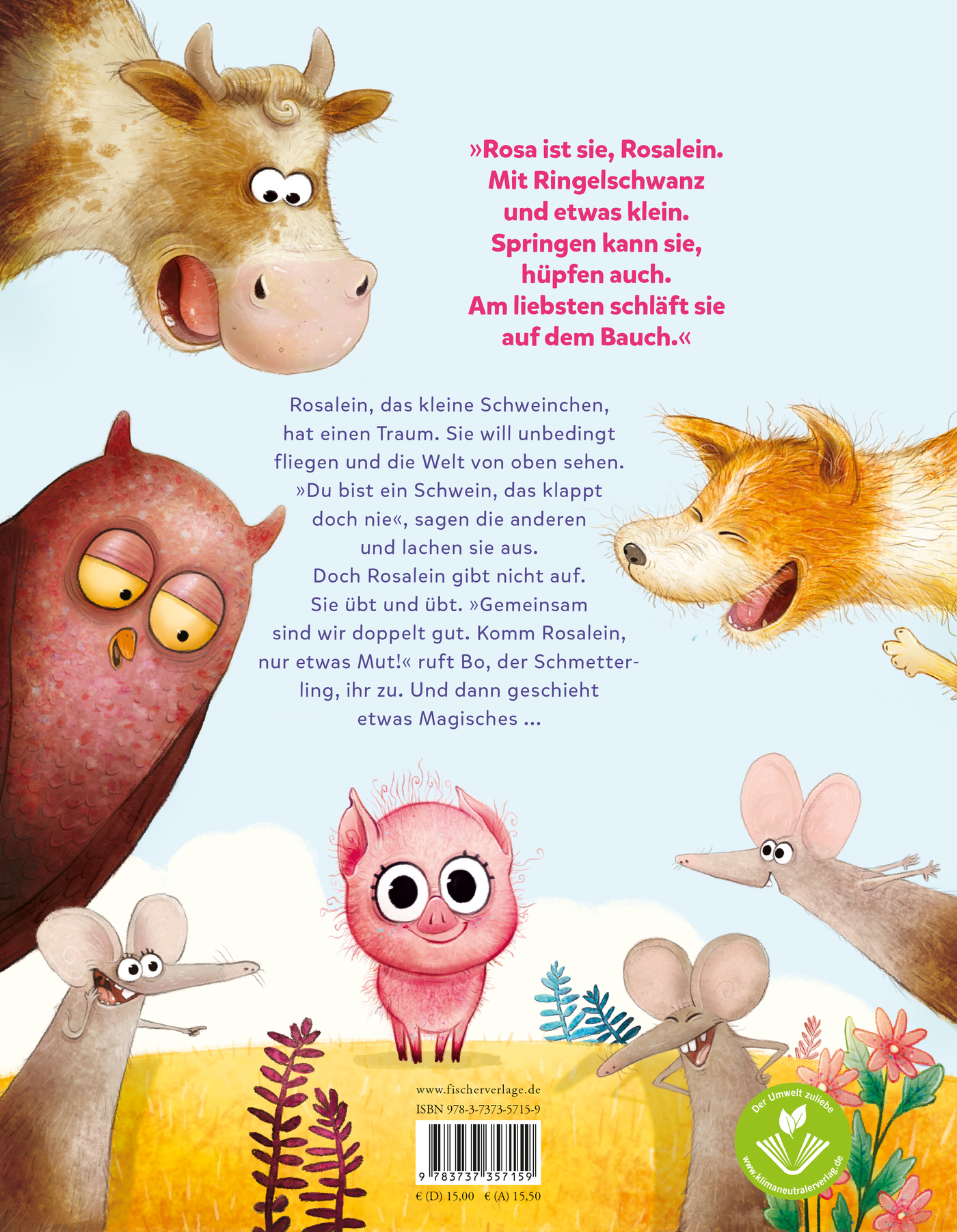 Rosa ist sie, Rosalein, mit Ringelschwanz und etwas klein. Rosalein hat einen Traum. Sie will fliegen, hoch oben am Himmel. Doch wie soll das gehen, so ohne Flügel? Ihre Freunde lachen sie aus. Sie ist nun mal ein Schwein, und kein Vogel. Das klappt doch nie! Aber Rosalein wünscht es sich so sehr und gibt nicht auf und übt und übt. Ihr bester Freund Bo, der Schmetterling, glaubt fest an sie. Gemeinsam und mit einem Schuss Magie wird das kleine Wunder wahr!