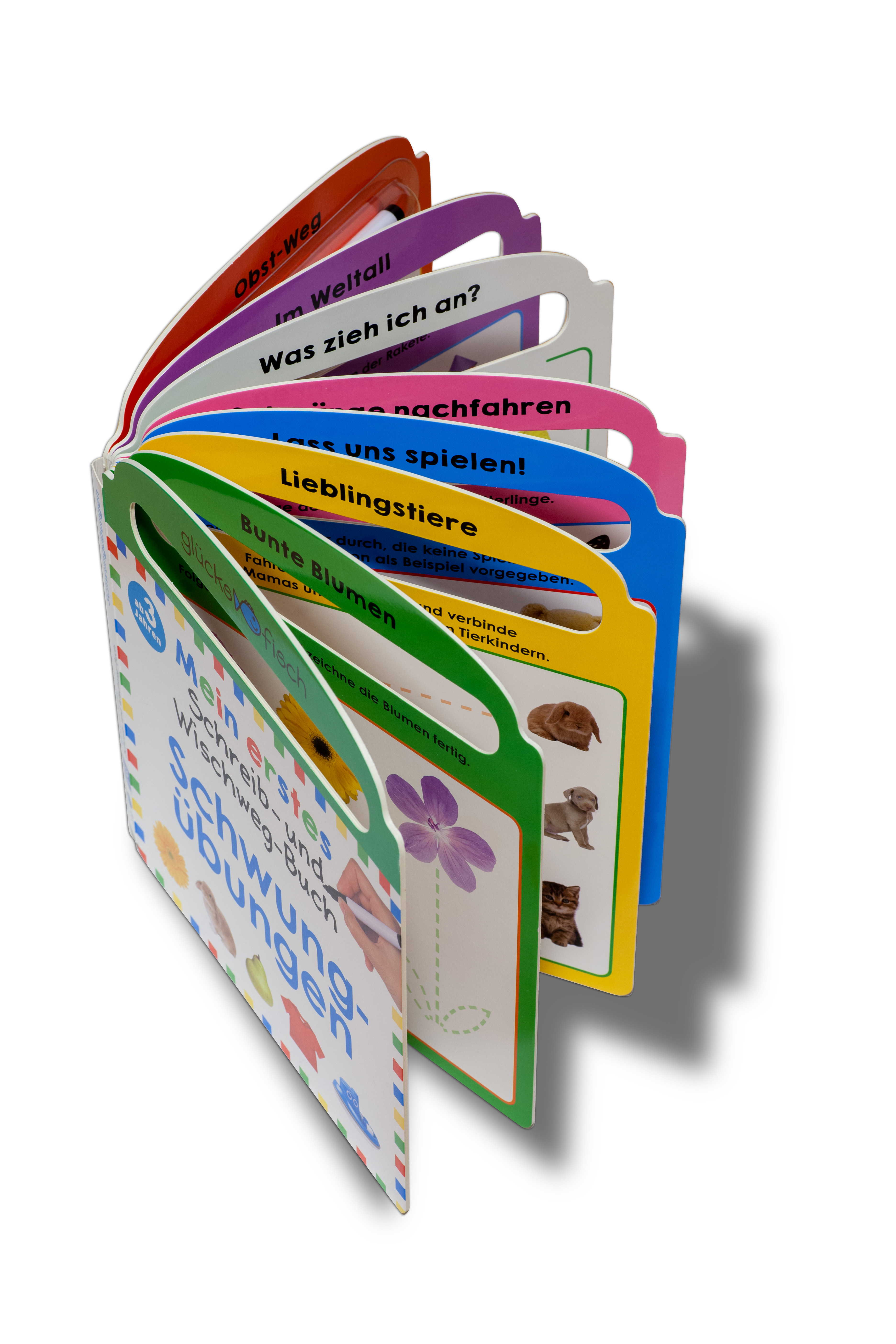 Ein stabiles Pappbilderbuch mit abwischbarem Stift zur Vorbereitung auf das Schreiben