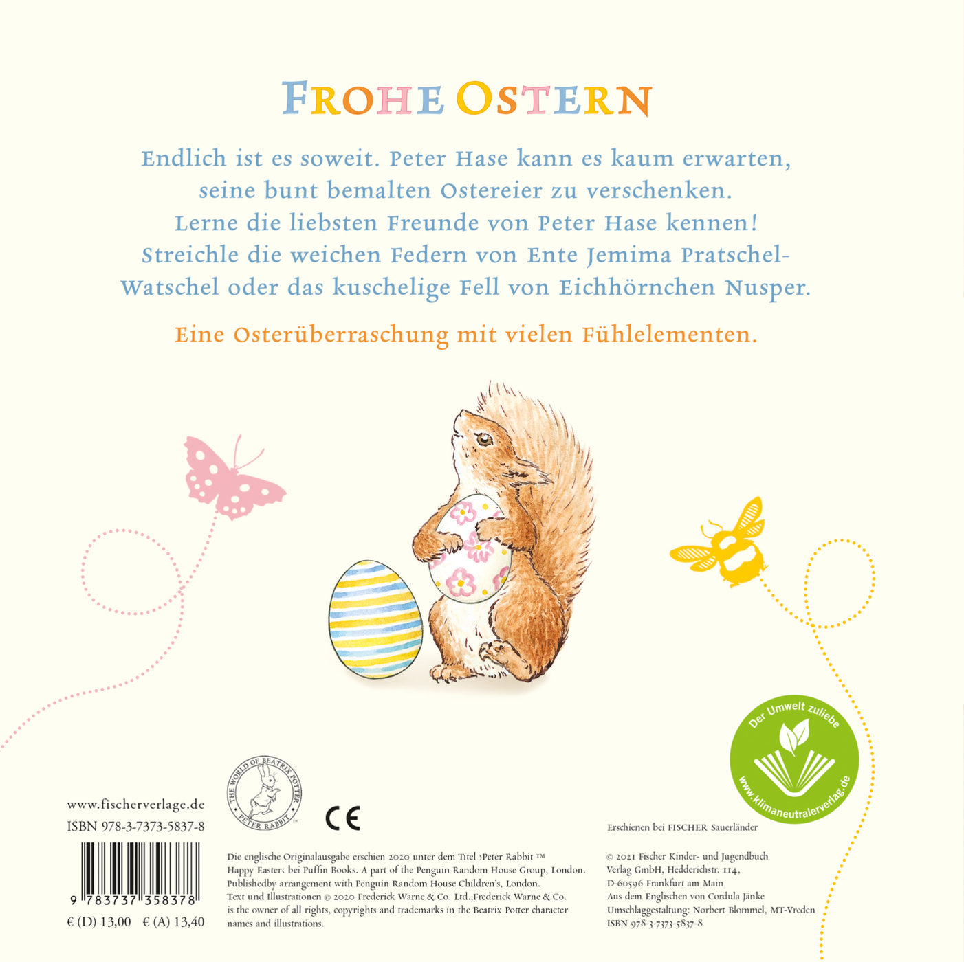 Endlich ist es soweit. Peter Hase kann es kaum erwarten, seine bunt bemalten Ostereier an seine liebsten Freunde zu verschenken. Und die freuen sich sehr über die Osterüberraschung. Mit vielen Fühlelementen können die kleinen Leser die weichen Federn von Ente Jemima Pratschel-Watschel streicheln oder das kuschelige Fell von Eichhörnchen Nusper knuddeln. Eine tolle Überraschung für jedes Osternest.
