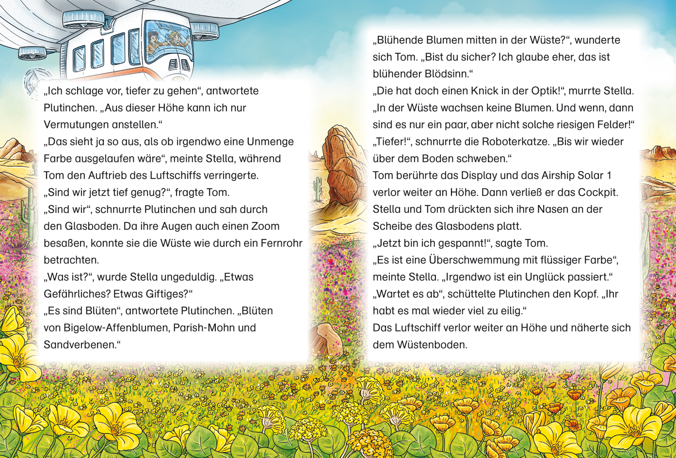 Auf der Bodenstation herrscht große Aufruhr. Zwei Forschungsdrohnen sind nach einem Sandsturm in der Wüste verschwunden. Der kleine Major Tom, seine Astronautenfreundin Stella und Roboterkatze Plutinchen begeben sich umgehend mit dem Luftschiff Airship Solar 1 auf die Suche nach ihnen. Auf der Reise zu dem Ort, von dem die letzten Funksignale der Drohnen ausgingen, droht das Luftschiff von einem Felsen zerstört zu werden. Außerdem geraten die drei Freunde in einen ungemütlichen Sturm. Ob die drei das Abenteuer Wüste heil überstehen, welche unerwarteten Entdeckungen sie machen und ob sie die Drohnen tatsächlich finden, erfahren lesefreudige Kinder ab 7 Jahren in diesem spannenden Kinderbuch.