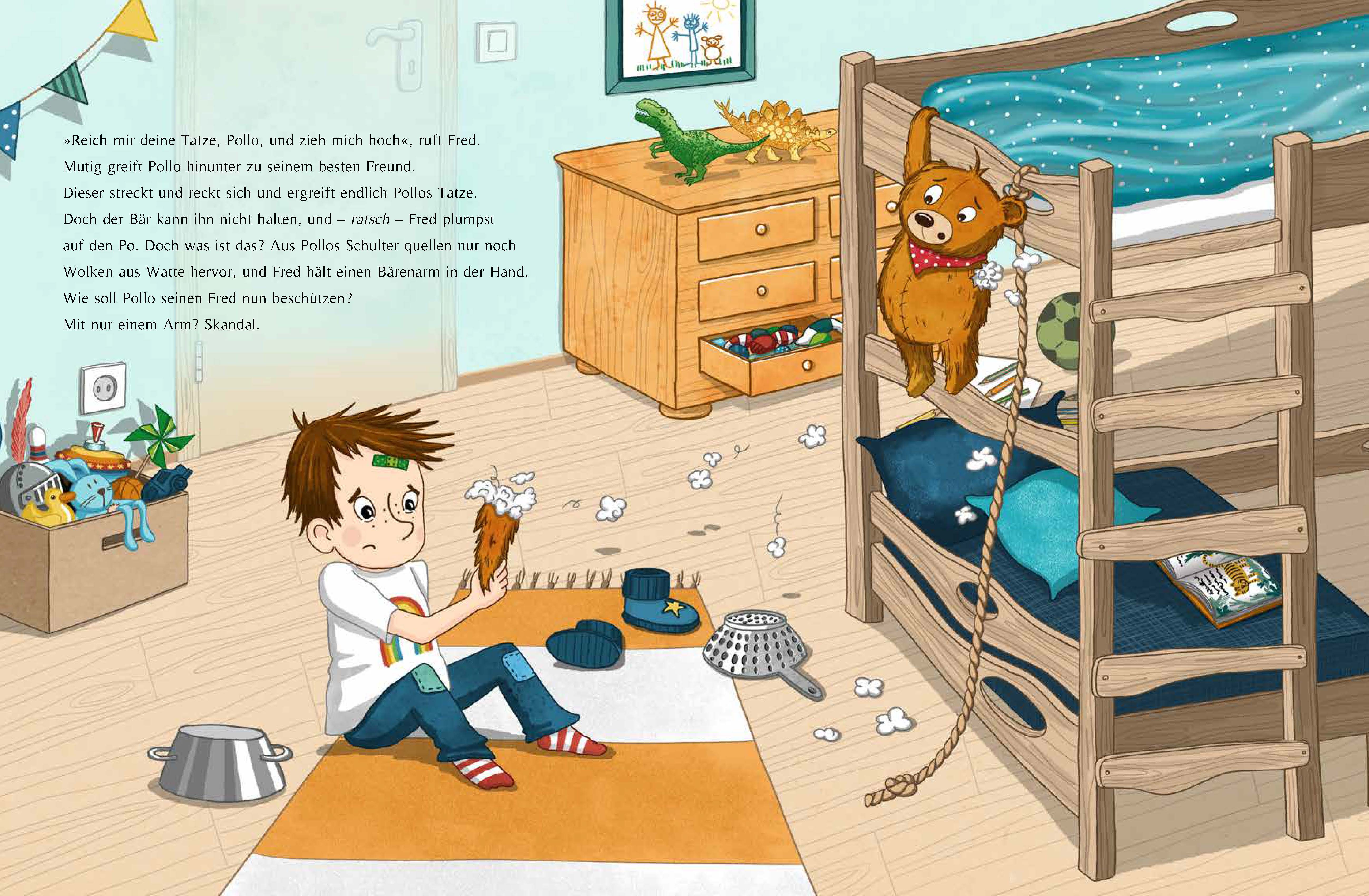 Doch eines Tages passiert es: Beim Herumtoben auf dem Hochbett verliert Kuschelbär Pollo seinen Arm. Fred ist entsetzt: Ein Bär mit nur einem Arm? Wie soll er denn jetzt noch mit ihm kuscheln? Auch Pollo ist schrecklich traurig und fühlt sich hässlich und nutzlos. Niedergeschlagen verzieht er sich in eine Ecke, denn niemand soll die dicken Bärentränen sehen, die auf seinen Pelz kullern.