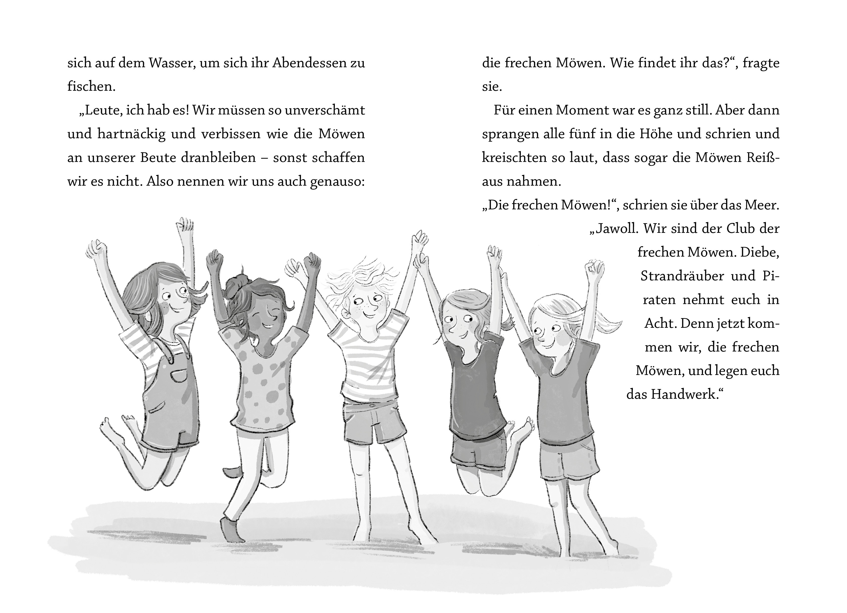 Wie gut, dass Stella und Rosalie schon neue Freunde gefunden haben: Nachbarsjunge Enno sowie die ungleichen Cousinen Naima und Elin. Gemeinsam gründen die fünf den Club der frechen Möwen. Bei einem ihrer Streifzüge finden sie heraus, dass in letzter Zeit immer wieder Robbenjunge von der nahegelegenen Aufzuchtstation verschwinden. Sie beschließen, der Sache auf den Grund zu gehen, und finden sich bald mitten in einem spannenden Inselabenteuer.