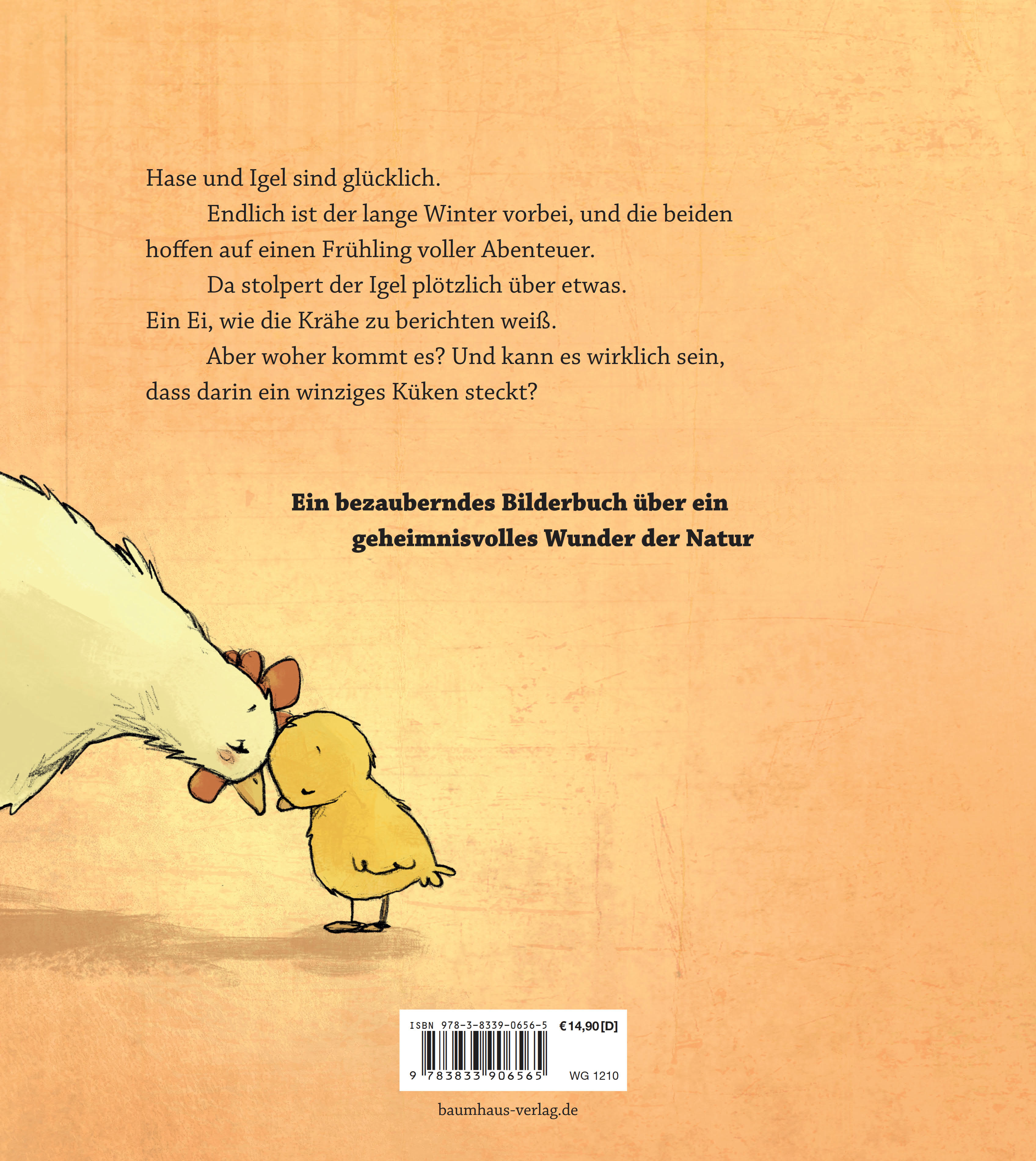 Hase und Igel sind glücklich. Endlich ist der Frühling da! Sie toben über Wiesen voller Klee und genießen es, dass draußen alles frisch und neu und herrlich bunt ist. Da stolpert der Igel über einen merkwürdigen Stein. Es ist ein Ei, wie die Krähe zu berichten weiß. Doch woher kommt das Ei? Und kann es wirklich sein, dass darin ein winziges Küken steckt?