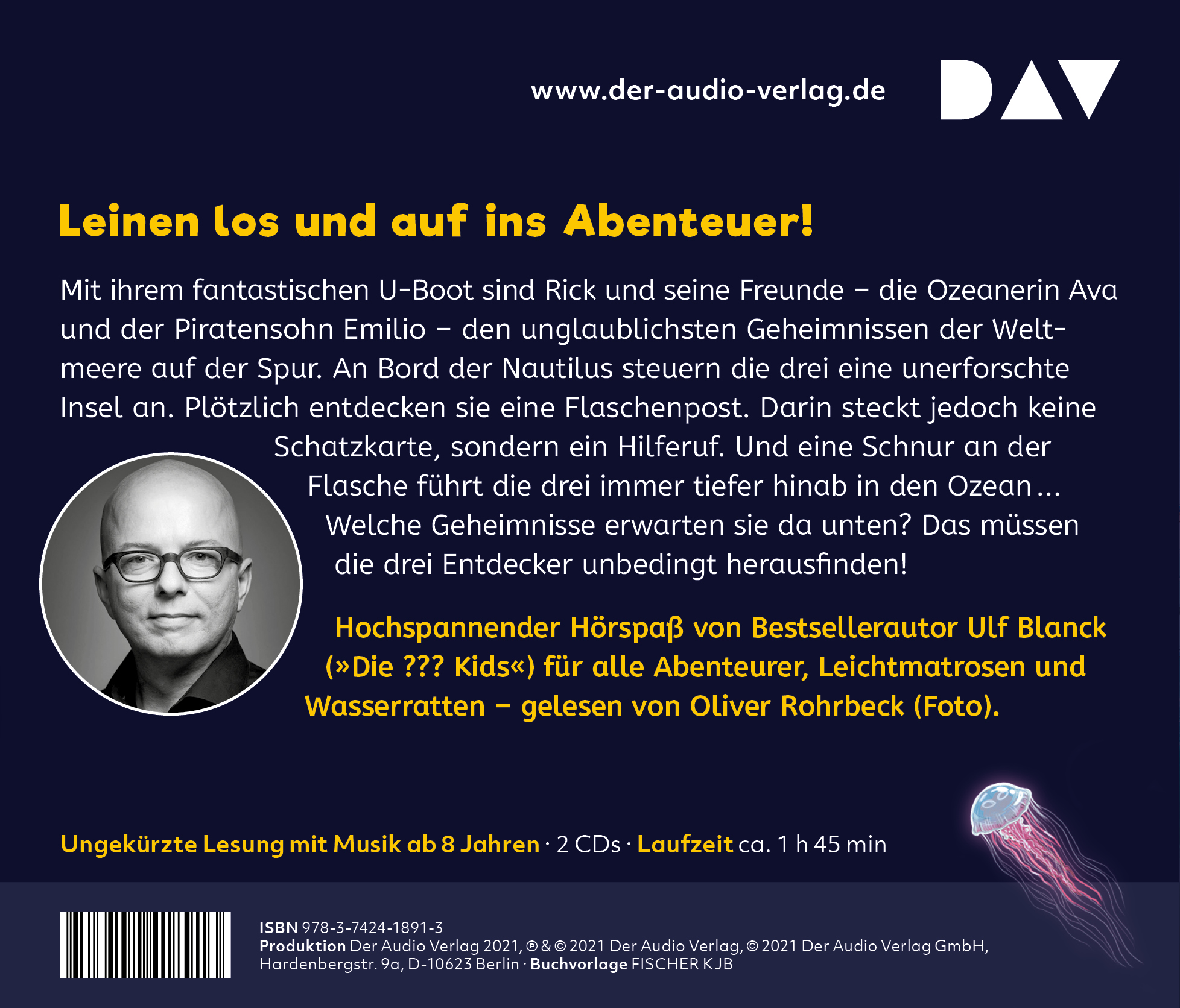 An Bord der Nautilus steuern Rick, Ava und Emilio eine unerforschte Insel an. Plötzlich entdecken sie eine Flaschenpost. Darin steckt jedoch keine Schatzkarte, sondern ein Hilferuf! Und eine Schnur an der Flasche führt die Abenteurer immer tiefer hinab in den Ozean. Welches Geheimnis erwartet sie da unten? Das müssen die drei Freunde unbedingt herausfinden! Ob verborgene Meereskolonien, bedrohliche Schwärme von Riesenquallen oder wie vom Erdboden verschluckte Frachter: An Bord ihres fantastischen U-Bootes gehen Rick & Co den unglaublichsten Rätseln der faszinierenden Unterwasserwelt auf den Grund.Ungekürzte Lesung mit Musik mit Oliver Rohrbeck2 CDs | ca. 1 h 45 min