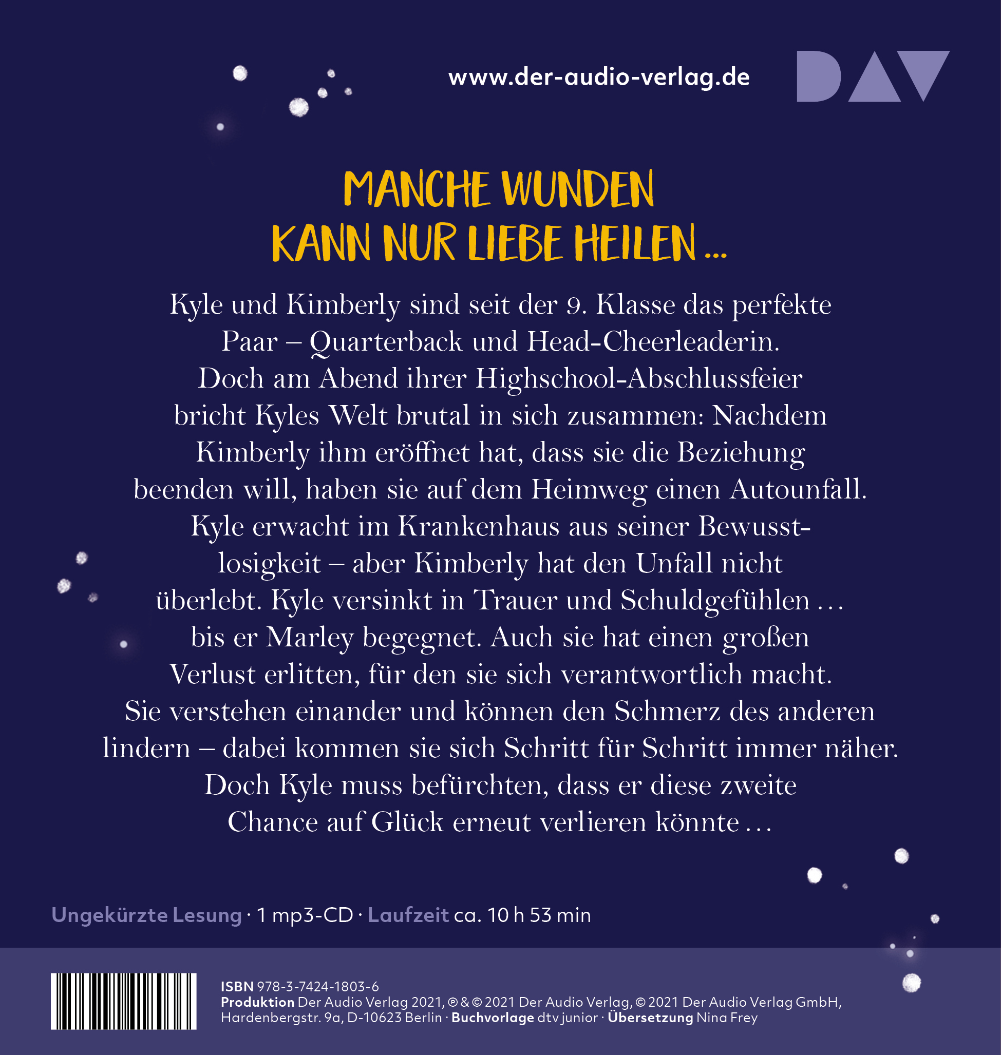 Kyle und Kimberly sind schon seit Jahren das perfekte Paar - Quarterback und Head-Cheerleader. Doch am Abend ihres Highschool-Abschlusses bricht Kyles Welt brutal zusammen: Kim hat sich heimlich an einer anderen Uni beworben, und gerade als sie ihre Beziehung beenden möchte, haben die beiden einen schrecklichen Autounfall. Kyle kommt im Krankenhaus mit schweren Verletzungen zu sich, Kim hat den Unfall nicht überlebt. Kyle versinkt in Trauer und Schuldgefühlen - bis er auf dem Friedhof Marley begegnet, die ebenfalls einen großen Verlust erlitten hat. Sie verstehen einander und können den Schmerz des anderen lindern, während sie sich von Tag zu Tag näherkommen.Ungekürzte Lesung mit Fabian Kluckert1 mp3-CD | ca. 10 h 53 min