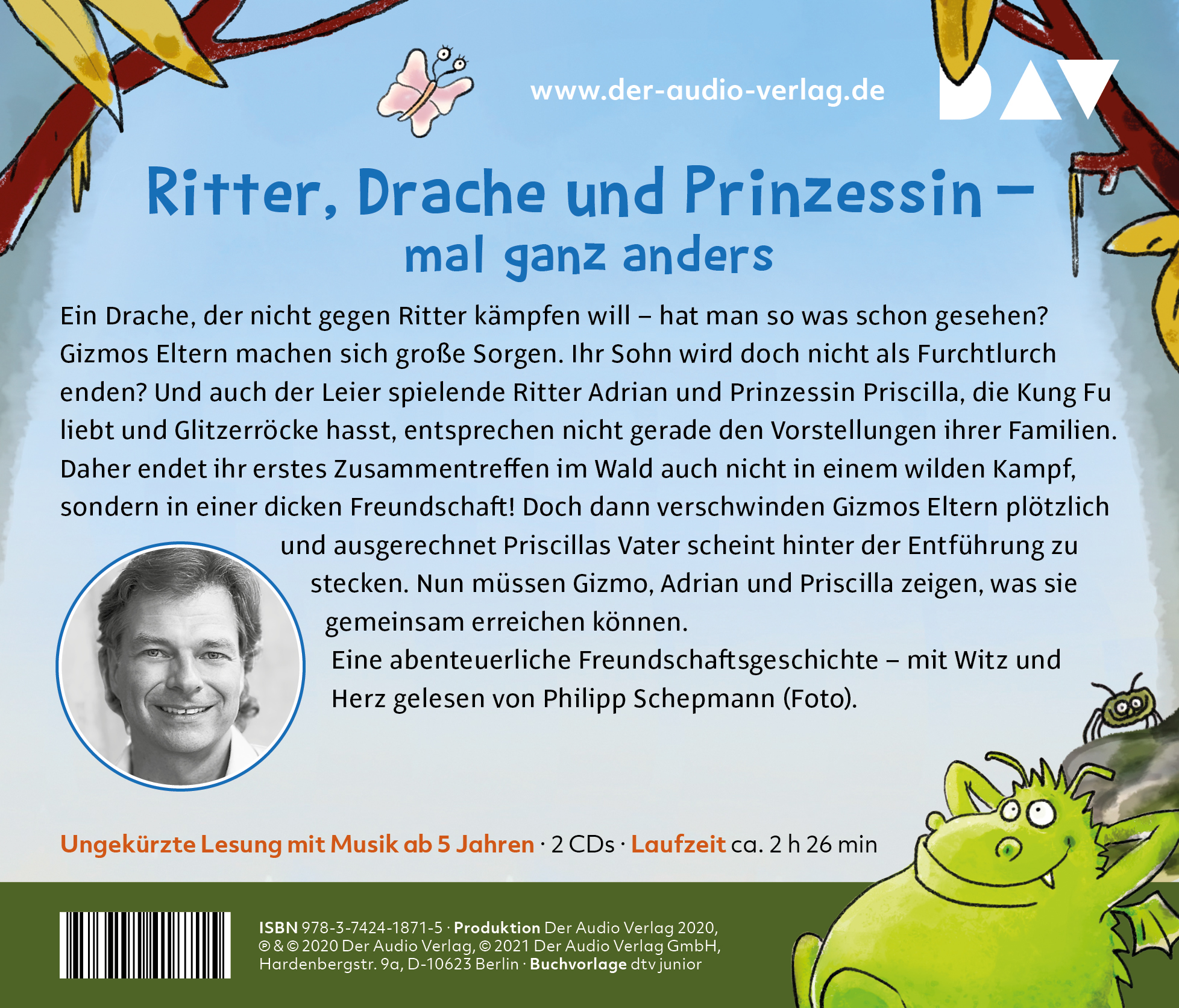 Gizmos Eltern sind besorgt: Ihr Drachensohn hat noch keinen Ritter erlegt - er wird noch als Furchtlurch enden! Auch der Leier spielende Ritterjunge Adrian und Prinzessin Priscilla, die ihr Kung-Fu- Training liebt und Glitzerröcke hasst, entsprechen nicht gerade den Vorstellungen ihrer Erziehungsberechtigten. Als die drei sich zufällig treffen - nachdem Adrian seinen Helm, Gizmo seinen Zahn und Priscilla ihr Einhorn verloren hat -, werden sie Freunde und müssen sich in ihrem ersten Abenteuer bewähren. Denn Gizmos Eltern werden beschuldigt, Prinzessin Priscilla geraubt zu haben. Die furchtlosen Drei müssen beweisen, was in ihnen steckt!Ungekürzte Lesung mit Musik mit Philipp Schepmann2 CDs | ca. 2 h 26 min
