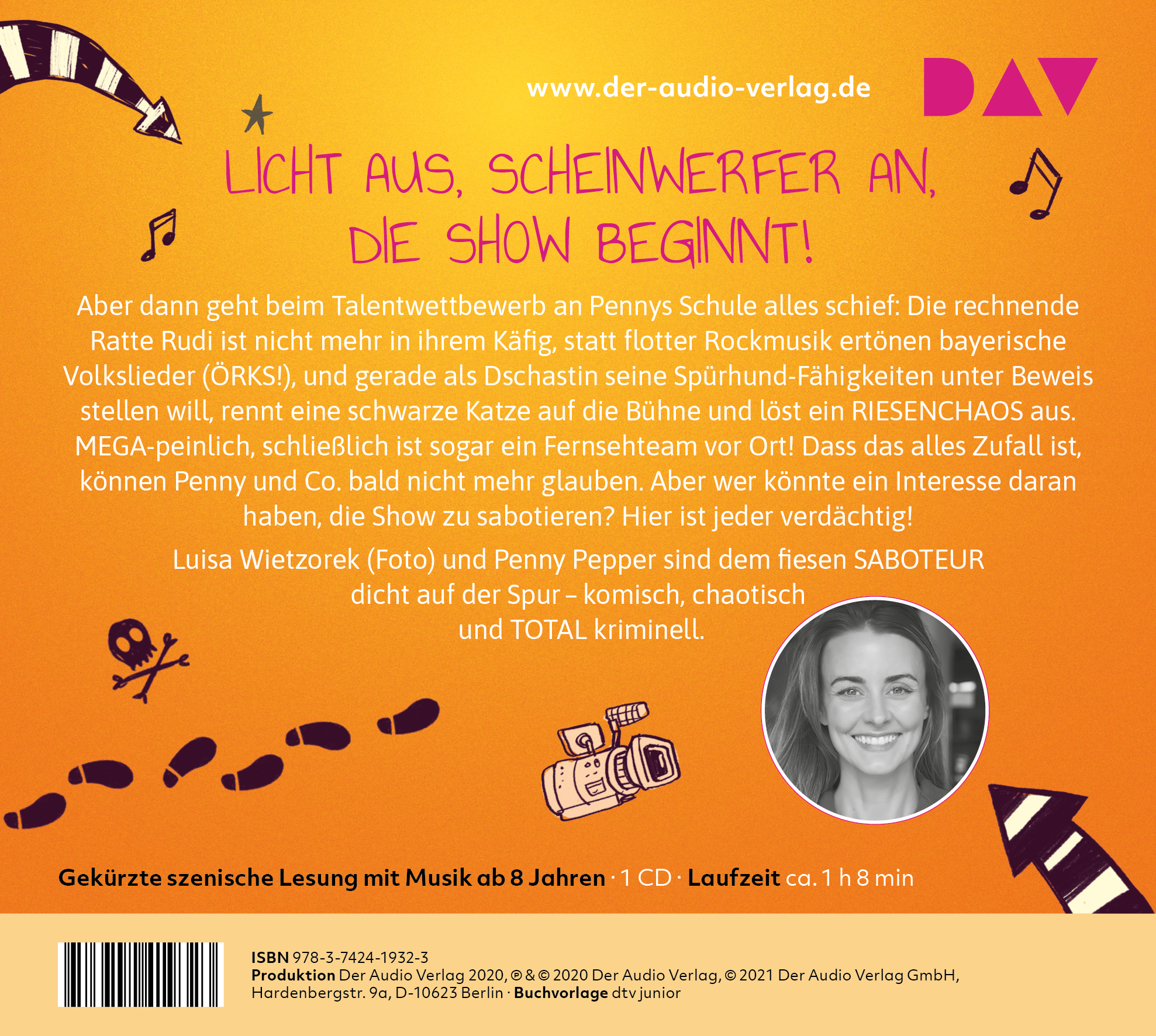 Beim Talentwettbewerb an Pennys Schule geht alles schief: Die rechnende Ratte Rudi ist nicht mehr in ihrem Käfig, statt flotter Rockmusik ertönen bayerische Volkslieder, und gerade als Dschastin seine Spürhund-Fähigkeiten unter Beweis stellen will, rennt eine schwarze Katze auf die Bühne und löst ein Riesenchaos aus. Mega-peinlich, schließlich ist sogar ein Fernsehteam vor Ort! Dass das alles Zufall ist, können Penny und Co. bald nicht mehr glauben. Aber wer könnte ein Interesse daran haben, die Show zu sabotieren?Ungekürzte szenische Lesung mit Musik mit Luisa Wietzorek1 CD | ca. 1 h 8 min