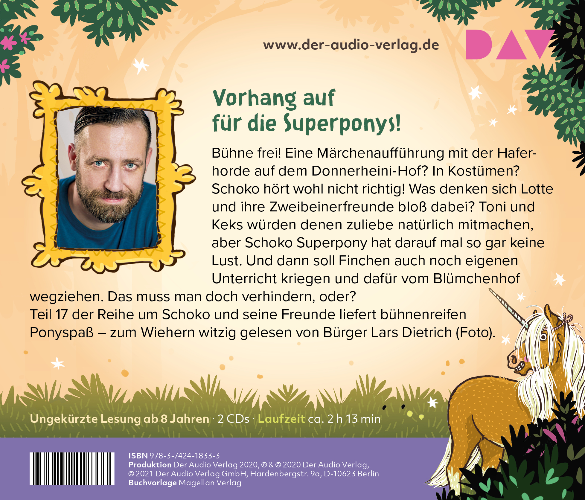 Bühne frei! Eine Märchenaufführung mit der Haferhorde auf dem Donnerheini-Hof? In Kostümen? Schoko hört wohl nicht richtig! Was denken sich Lotte und ihre Zweibeinerfreunde bloß dabei? Toni und Keks würden denen zuliebe natürlich mitmachen, aber Schoko Superpony hat darauf mal so gar keine Lust. Und dann soll Finchen auch noch eigenen Unterricht kriegen und dafür vom Blümchenhof wegziehen. Das muss man doch verhindern, oder? Teil 17 der zum Wiehern guten Reihe um Schoko und seine Freunde - mit viel PS (Ponystärken) gelesen von Bürger Lars Dietrich.Ungekürzte Lesung mit Bürger Lars Dietrich2 CDs | ca. 2 h 13 min