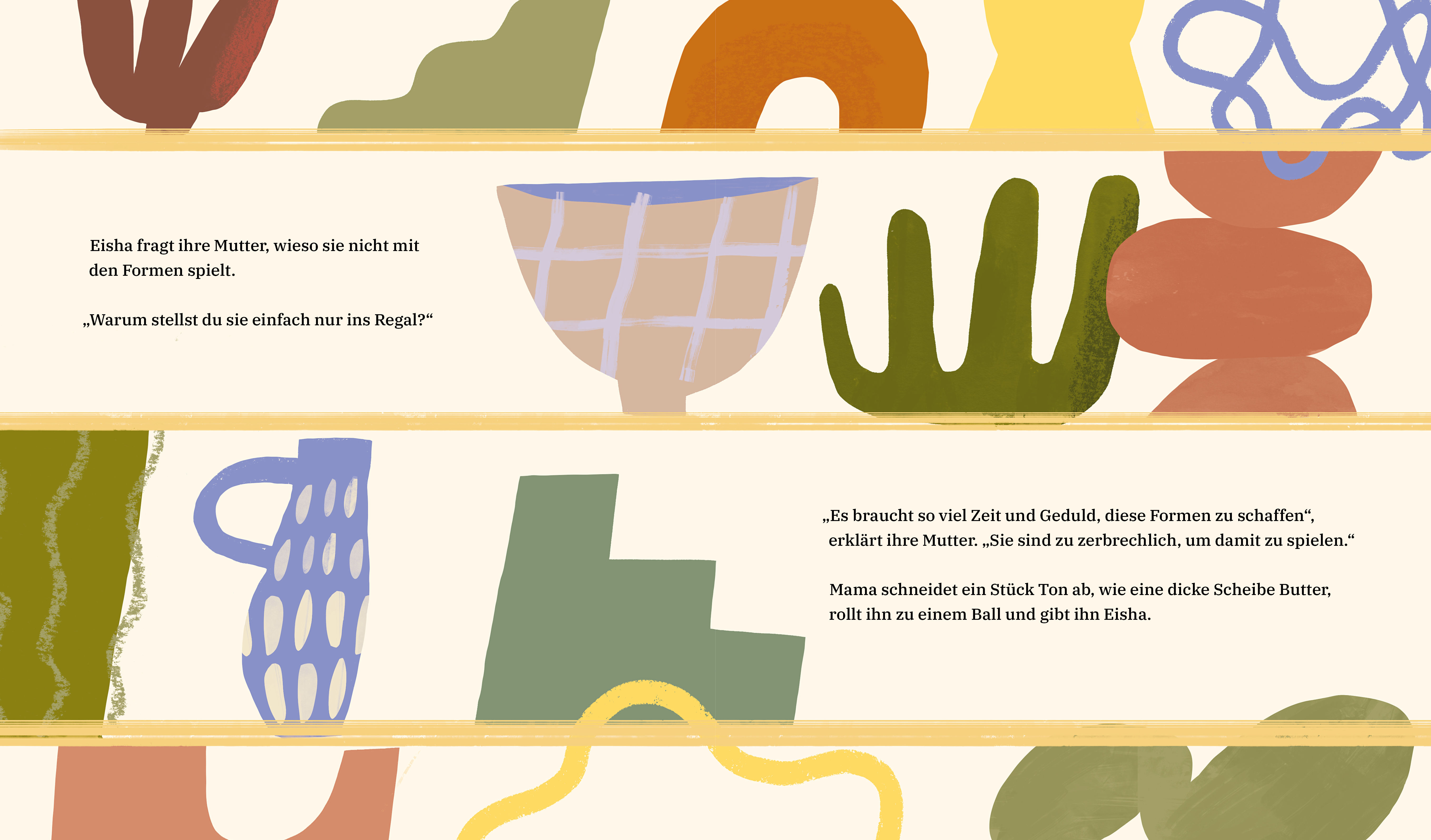 Eishas Mutter ist Keramikkünstlerin. In ihrem Atelier macht Eisha eine Form aus Ton. Diese Form macht Eisha ganz besonders glücklich, denn sie erinnert sie an den letzten Sommer, als sie mit ihrem Papa Zitronen gepflückt hat. Sie malt ihre kleine Form mit dem gleichen leuchtenden Gelb von Zitronen an. Als ihre Form zu Boden fällt und in viele Stücke zerbricht, ist Eisha sehr traurig. In kraftvollen Worten und Bildern zeigt Kenesha Sneed, wie Eisha lernt, mit dem Verlust und ihrer Trauer umzugehen, und wie tröstend es sein kann, aus den Scherben dessen, was vergangen ist, etwas Neues zu schaffen. Mit starken Farben und charaktervollen Linien zeigt Kenesha Sneed, dass in jedem und jeder von uns die Kraft zu Heilen und zu Schaffen steckt.Eine sensibles Bilderbuch-Debut der afro-amerikanischen Künstlerin Kenesha Sneed.Dieses Buch wird klimaneutral produziert.