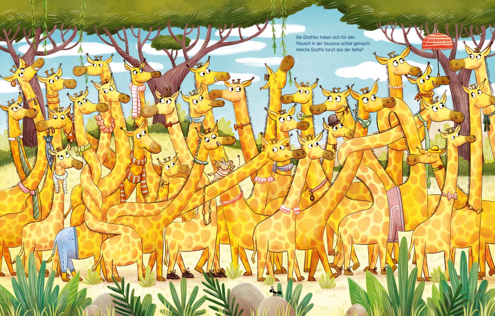 Alle Giraffen tragen beim Picknick in der Savanne Schleifen, Tücher oder Krawatten – eine nicht. Alle Fische im Ozean sind gestreift – einer nicht. Alle Bären essen etwas – einer nicht. Alle Schweinchen haben sich schmutzig gemacht – eines nicht.Wer findet auf 11 großen Wimmelbildern die eine Figur, die sich von allen anderen unterscheidet und die aus der Reihe tanzt? Genau hinschauen, vergleichen, finden und ganz viel Spaß haben!Mit zusätzlichen Suchaufgaben auf jeder Seite und Lösungen am Ende des Buches.