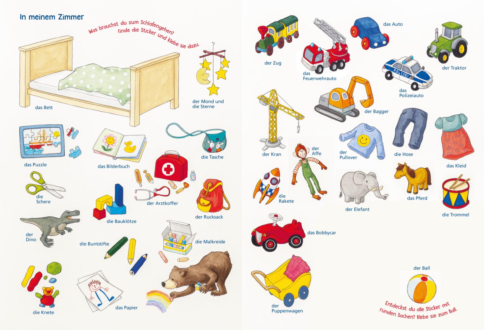 Bilderwörterbuch mit 200 Begriffen und über 40 wiederverwendbaren Stickern.