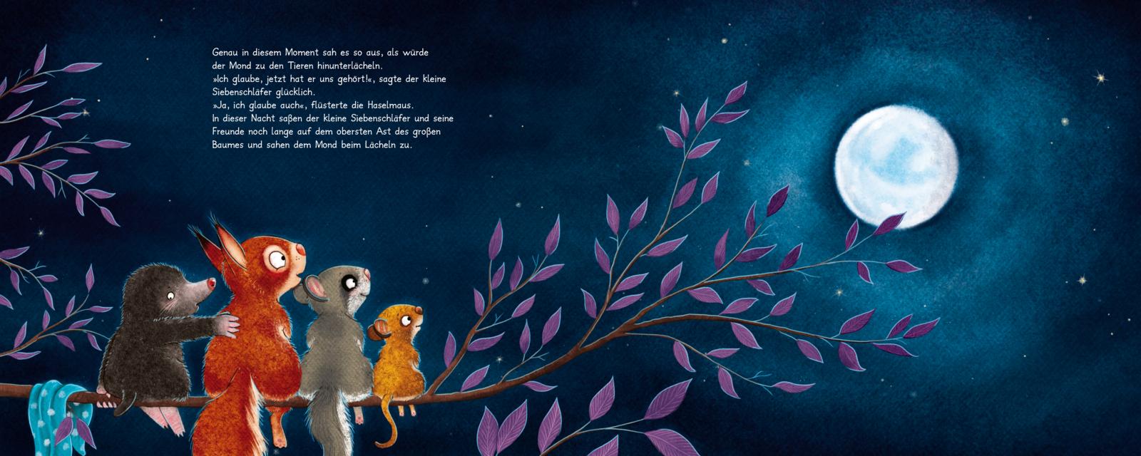 Jeden Abend sagt der kleine Siebenschläfer Gute Nacht zu seiner Mama, seinem Papa und zum großen, hellen Mond, der Nacht für Nacht in seine Höhle scheint. Doch der Mond antwortet ihm nie. Wie denn auch, wenn er so weit weg ist! Ein einziges Mal will der kleine Siebenschläfer so nah an den Mond kommen, dass er ihm Gute Nacht sagen kann. Zum Glück hat er seine Freunde, die ihm bei diesem abenteuerlichen Unternehmen zur Seite stehen. Ob sie es gemeinsam schaffen, dem Mond Gute Nacht zu sagen?