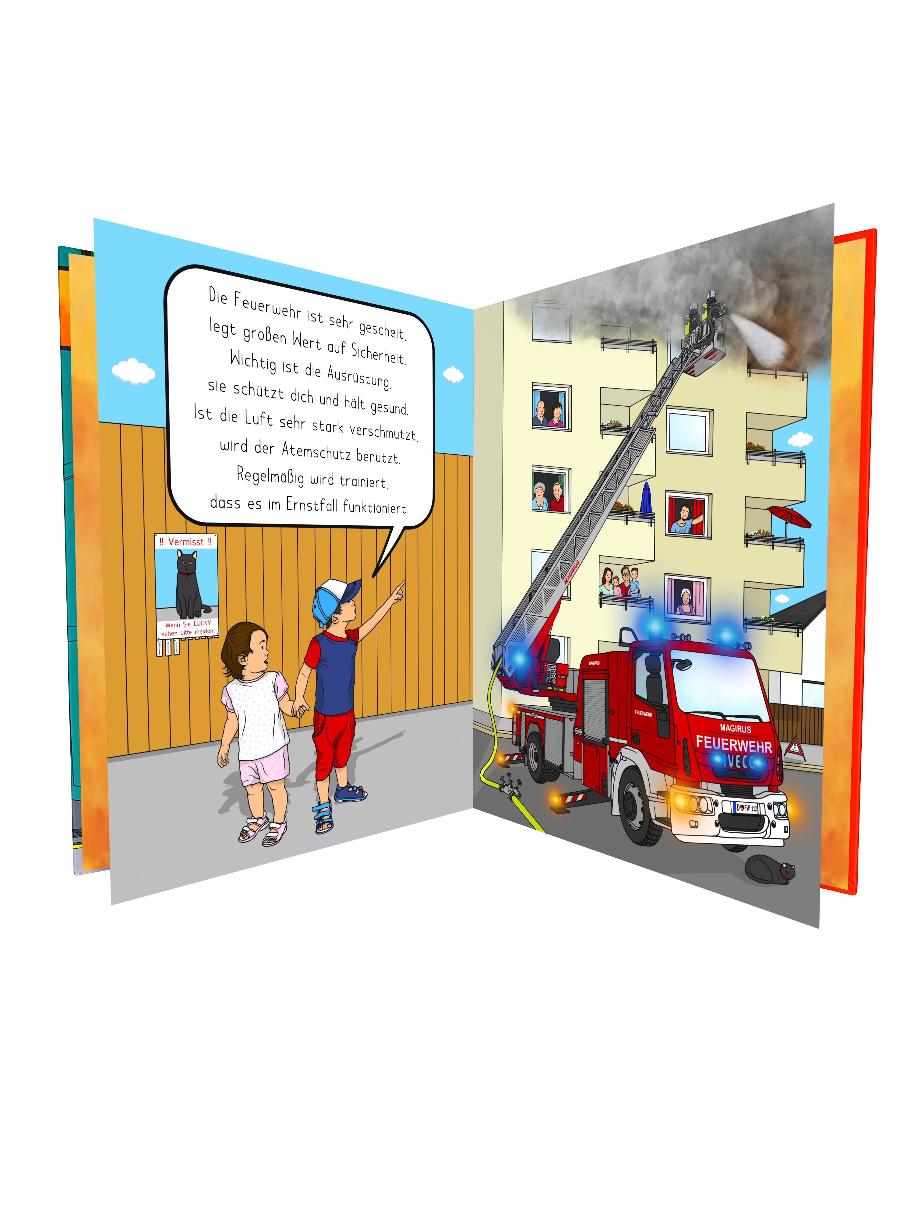In diesem Feuerwehrbuch wird auf der rechten Seite ein Bild einer alltäglichen Situation bei der Feuerwehr dargestellt, auf der linken sieht man Kinder, welche in einem kleinen Reim die Situation beschreiben. Die Kinder bekommen auf diese Art einen tollen Einblick wie abwechslungsreich dieser Beruf sein kann.