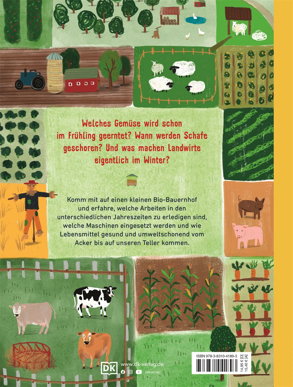 Mit diesem farbenfroh illustrierten Sachbuch erleben Kinder ein ganzes Jahr auf einem Bio-Bauernhof: Von der ersten Gemüseernte im Frühling und der Arbeit der Bienen im Bienenstock im Sommer über das Einkochen von Marmelade im Herbst bis zum Schneiden der Obstbäume im Winter. Bunte Illustrationen zeigen den jungen Leser*innen hautnah das vielfältige Leben auf dem Bauernhof vom Besuch auf dem Wochenmarkt über die Schafschur bis zur Apfelernte.