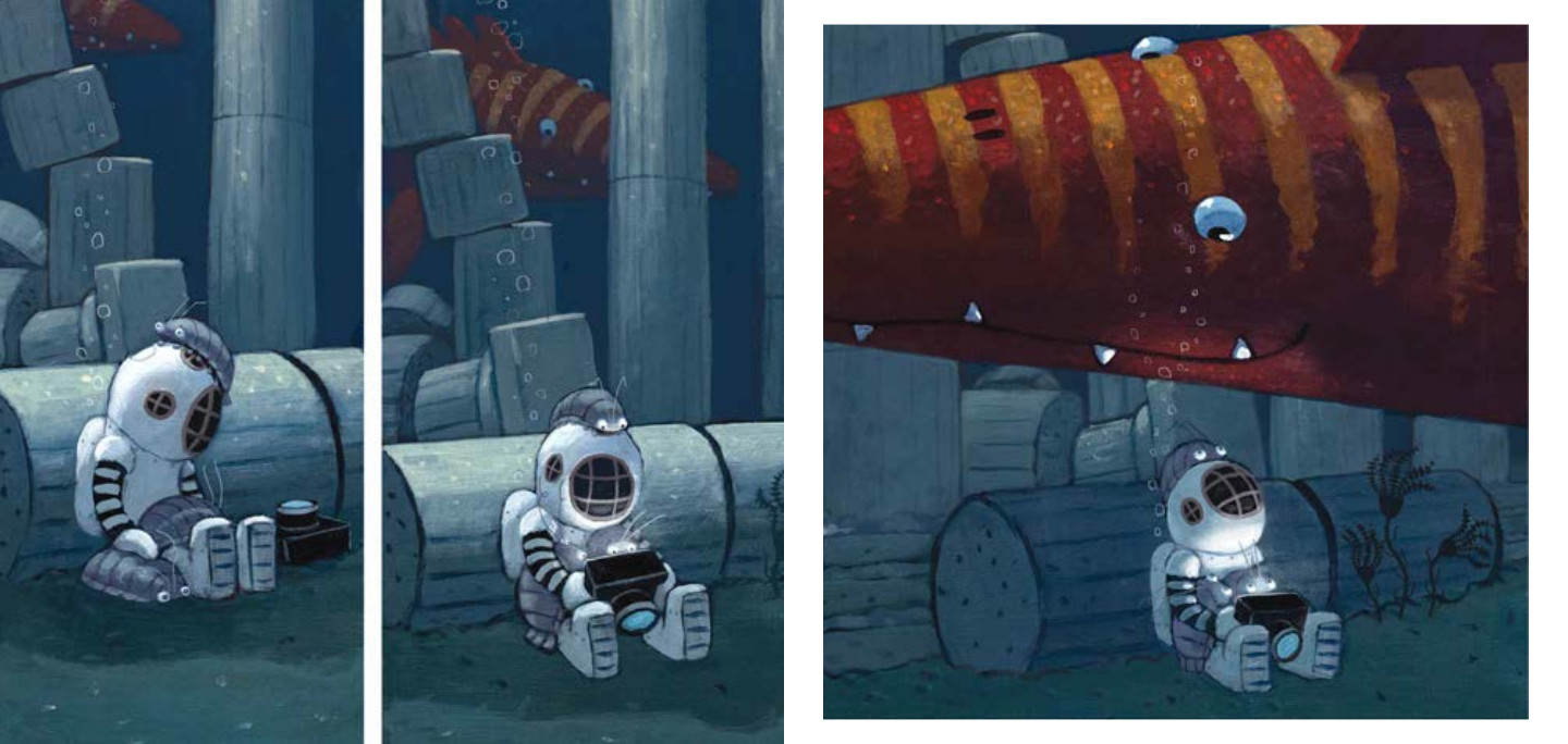 Ein Tiefsee-Bus bringt eine Kindergruppe hinab zum Meeresboden. Dort sind sie in einer anderen Welt voller Muscheln, Schwarzen Rauchern, Leuchtkalmaren und Riesenasseln. Eines der Kinder zückt die Kamera und will unbedingt Fotos machen. Als es aber auf einem Wrack eine Schatzkiste entdeckt, stürzt es unversehens in eine Schlucht ... Auf sich alleingestellt bleibt dem Kind nur abzuwarten, ob die Gruppe es finden wird. Stattdessen nähert sich ein Wesen, das eigentlich nur ein Pliosaurus sein kann ...Dieses neue textlose Bilderbuch von John Hare, das seine großartige Fähigkeit zeigt, allein durch Gesten komplexe Geschichten zu erzählen und Gefühle deutlich werden zu lassen.
