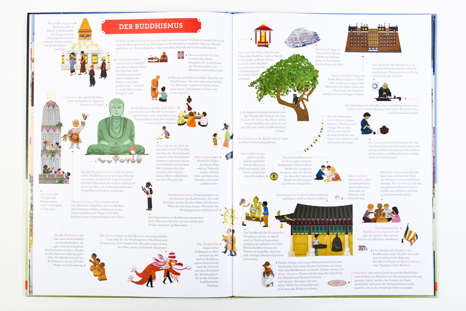 »Auf je einer Doppelseite sind die fünf großen Glaubensgruppen Hinduismus, Buddhismus, Judentum, Christentum und Islam dargestellt, was in der wimmeligen Vielfalt großartig ist. Je länger man schaut, desto mehr sieht man...« Susann Schädlich, DIE ZEIT, 6.4.2017