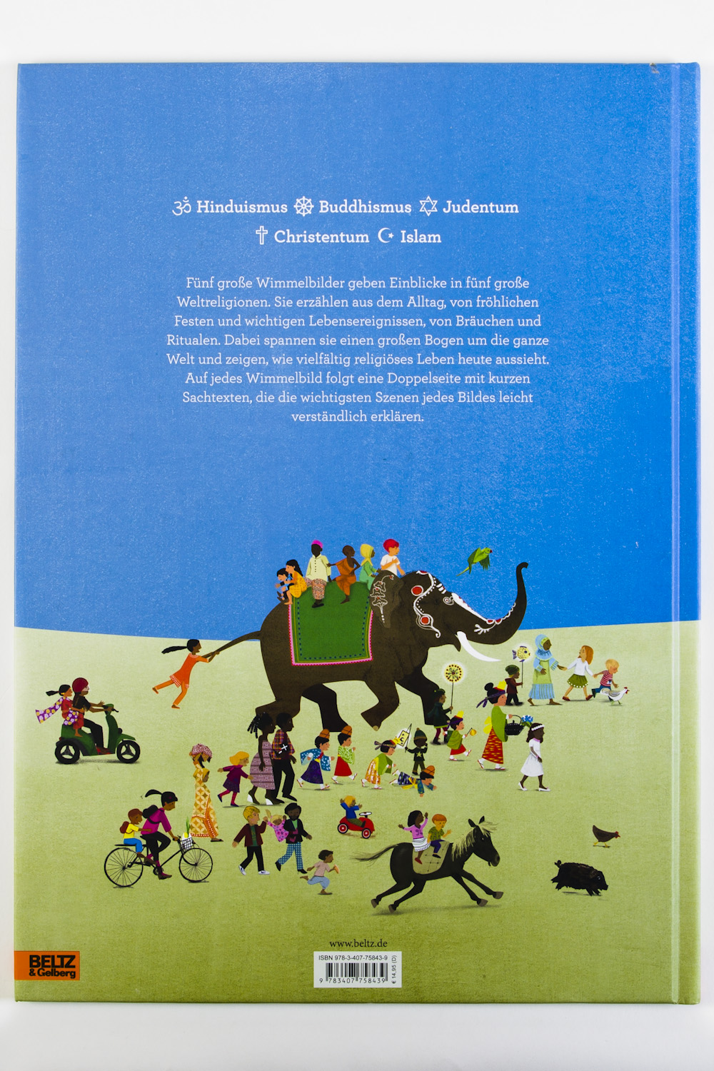 Hinduismus, Buddhismus, Judentum, Christentum und Islam, jede der fünf Weltreligionen wird auf zwei Doppelseiten im großen Format vorgestellt: mit je einem Wimmelbild und einer Infoseite, die die wichtigsten 40 Szenen des Wimmelbildes mit kurzen Texten leicht verständlich erklärt. Dieses Buch zeigt eine bunte Vielfalt des Glaubens und erzählt aus dem Alltag - so unmittelbar und direkt, dass man meint, das Stimmengewirr und die Musik auf einem Fest zu hören oder die Gerüche auf einem Markt wahrzunehmen.