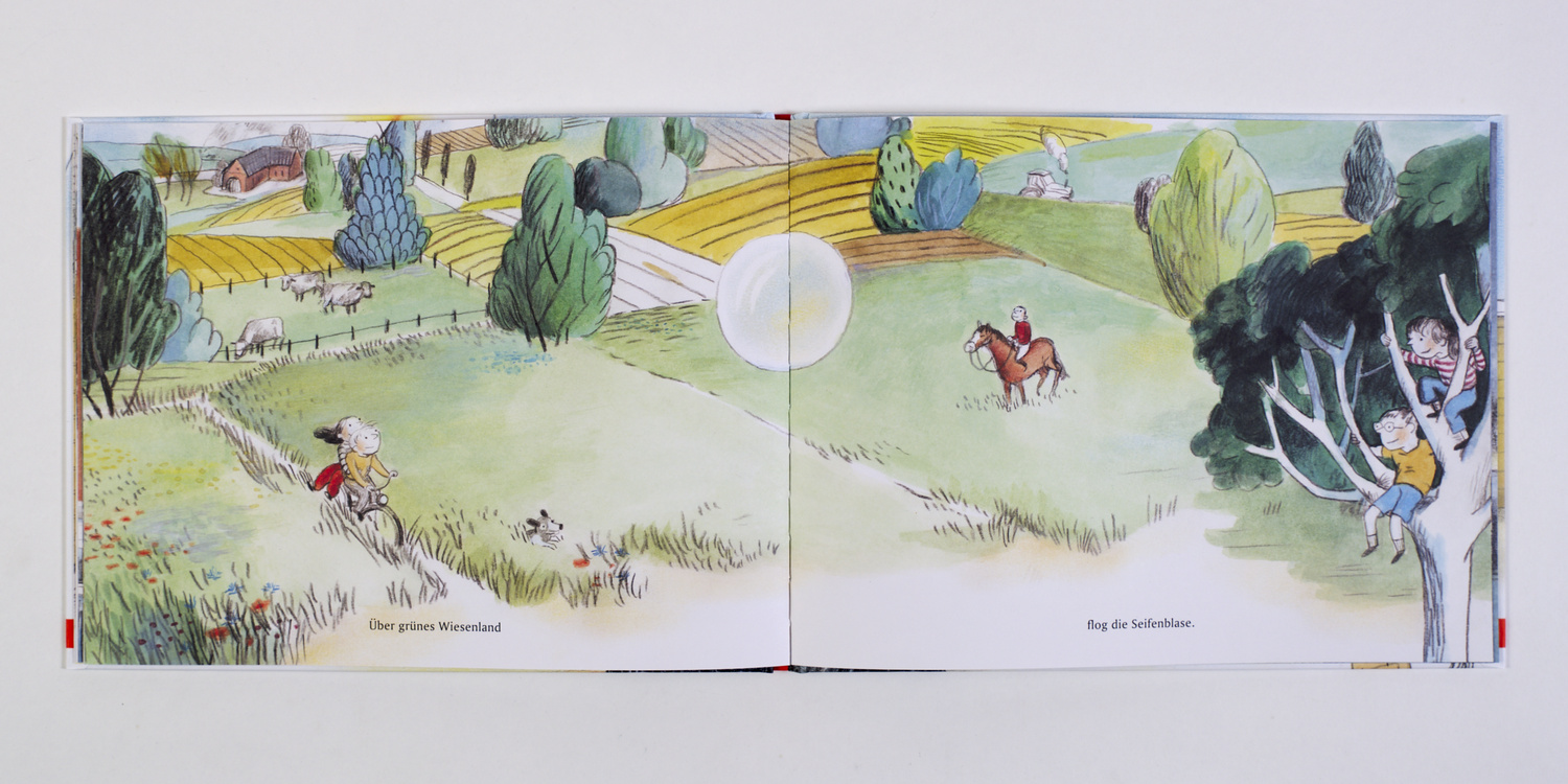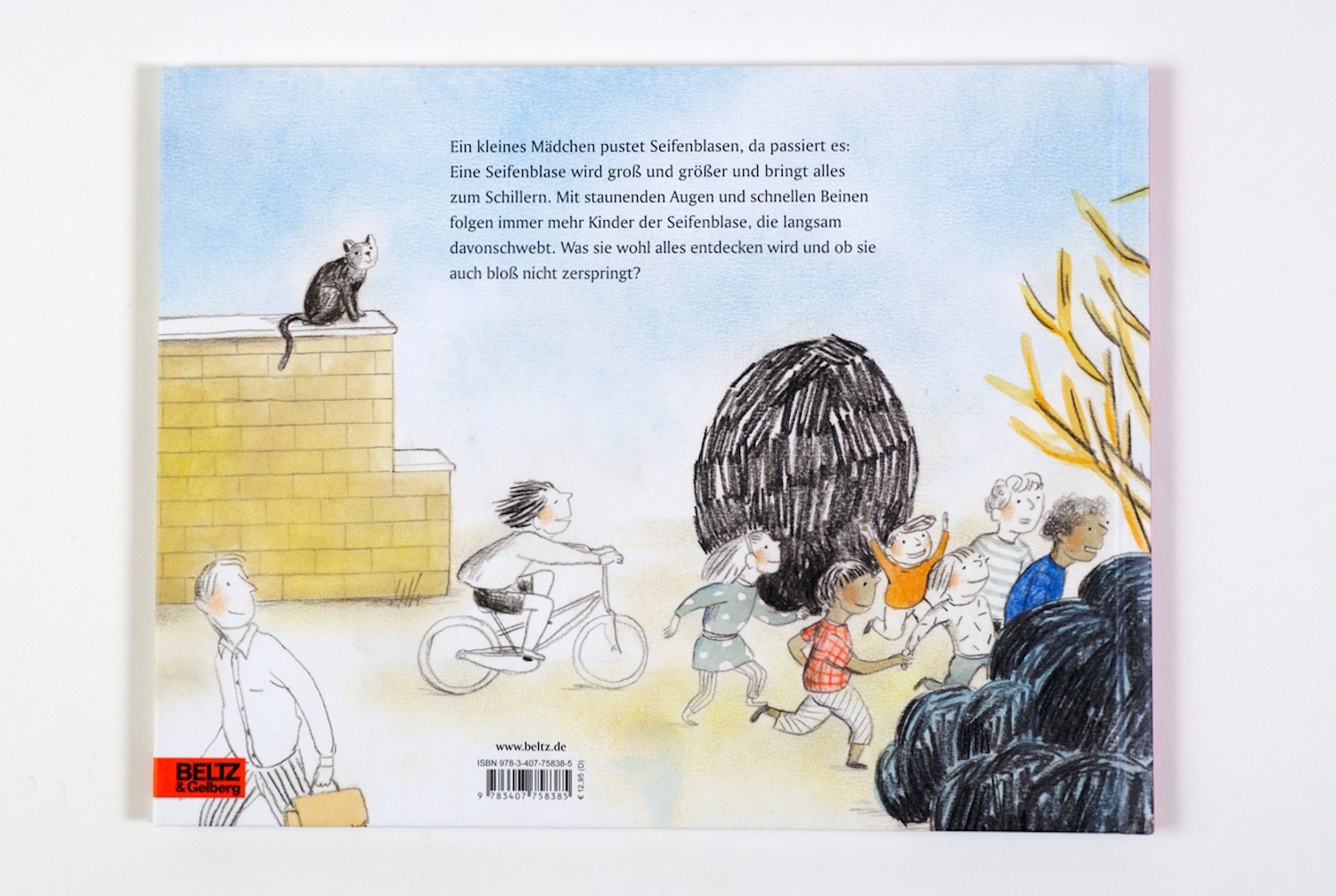 Schimmernd bunt, schwerelos und frei - Seifenblasen lassen Kinderherzen höher schlagen. Besonders, wenn eine von ihnen wundersam groß wird und sich zu einem Abenteuer aufmacht. Was sie wohl alles auf ihrem Flug entdecken wird und ob sie auch bloß nicht zerspingt? Niemand vermag Begeisterung und Bangen so treffend in Worte zu fasssen wie Josef Guggenmos. Heike Herold spinnt daraus eine Bildgeschichte mit staunenden Zwei- und Vierbeinern, ulkigen Zufällen und überraschenden Begegnungen.