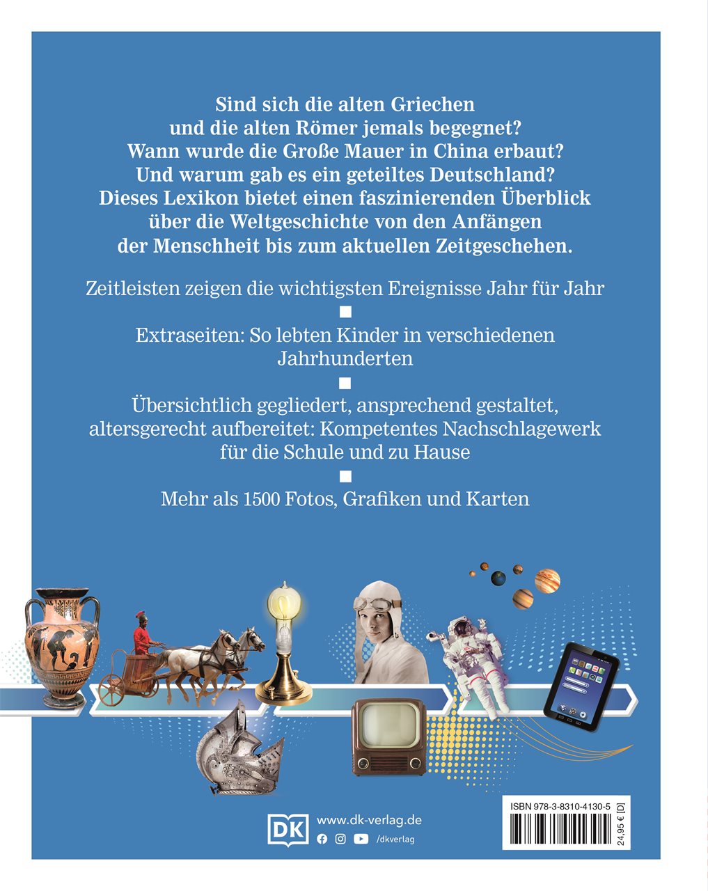 Sind sich die alten Griechen und Römer jemals begegnet? Was ist älter: die Pyramiden in Ägypten oder die Große Mauer in China? Warum wurde Deutschland nach dem Zweiten Weltkrieg geteilt? Dieses Kinderlexikon aus der DK Erfolgsreihe "Wissen für clevere Kids" nimmt Kinder ab 10 Jahren mit auf eine spannende Reise durch die Geschichte von den ersten Menschen über das Mittelalter bis heute. Über 1.500 Fotos, Grafiken und Karten zeigen wichtige Personen, kritische Wendepunkte sowie bedeutende Artefakte aus der Menschheitsgeschichte. Detailreiche Zeitleisten erklären die wichtigsten Ereignisse Jahr für Jahr für einen besseren Überblick.