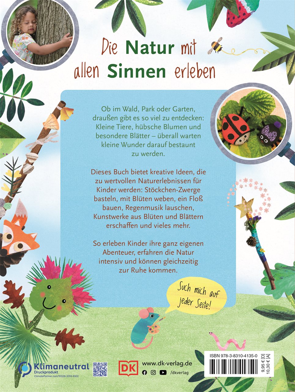 Weg mit dem Smartphone und ab nach draußen! Dieses außergewöhnliche Naturbuch für Kinder lockt selbst eingefleischte Stubenhocker ins Grüne. Rund 40 originelle Bastelideen und Outdoor-Spiele für Kinder animieren zum Ausprobieren und lassen Kids die Natur mit allen Sinnen erleben - ob beim Basteln von witzigen Blätter-Tieren oder beim Bau einer Waldhütte. Dabei lernen die kleinen Naturfreunde spielerisch die facettenreiche Tier- und Pflanzenwelt kennen und lieben.