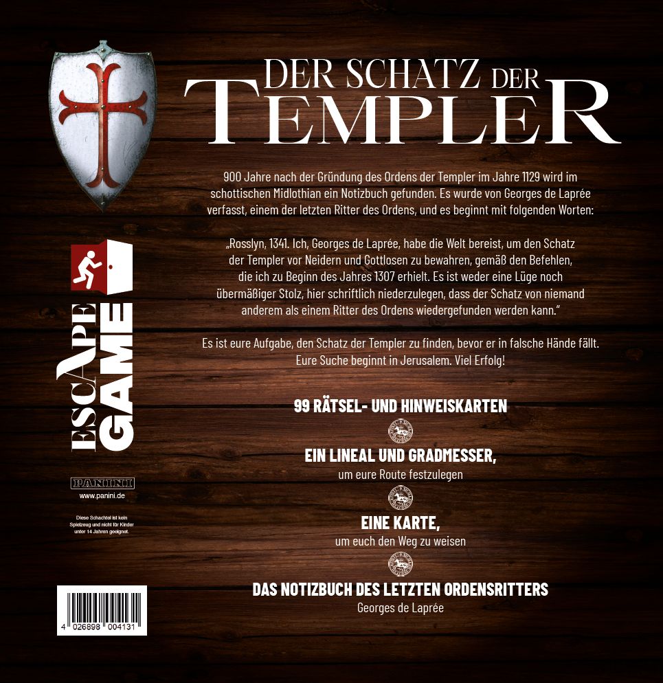 ESCAPE GAME: DER SCHATZ DER TEMPLER900 Jahre nach der Gründung des Ordens der Templer im Jahre 1129 wird im schottischen Midlothian ein Notizbuch gefunden. Es wurde von Georges de Laprée verfasst, einem der letzten Ritter des Ordens, und es beginnt mit folgenden Worten:"Rosslyn, 1341. Ich, Georges de Laprée, habe die Welt bereist, um den Schatz der Templer vor Neidern und Gottlosen zu bewahren, gemäß den Befehlen, die ich zu Beginn des Jahres 1307 erhielt. Es ist weder eine Lüge noch übermäßiger Stolz, hier schriftlich niederzulegen, dass der Schatz von niemand anderem als einem Ritter des Ordens wiedergefunden werden kann."Es ist eure Aufgabe, den Schatz der Templer zu finden, bevor er in falsche Hände fällt.Eure Suche beginnt in Jerusalem. Viel Erfolg!Inhalt:- 99 Rätsel- und Hinweiskarten- Lineal und Gradmesser, um eure Route festzulegen- eine Karte, um euch den Weg zu weisen- das Notizbuch des letzten Ordensritters Georges de LapréeFür 2 bis 6 Spieler,90 Minuten