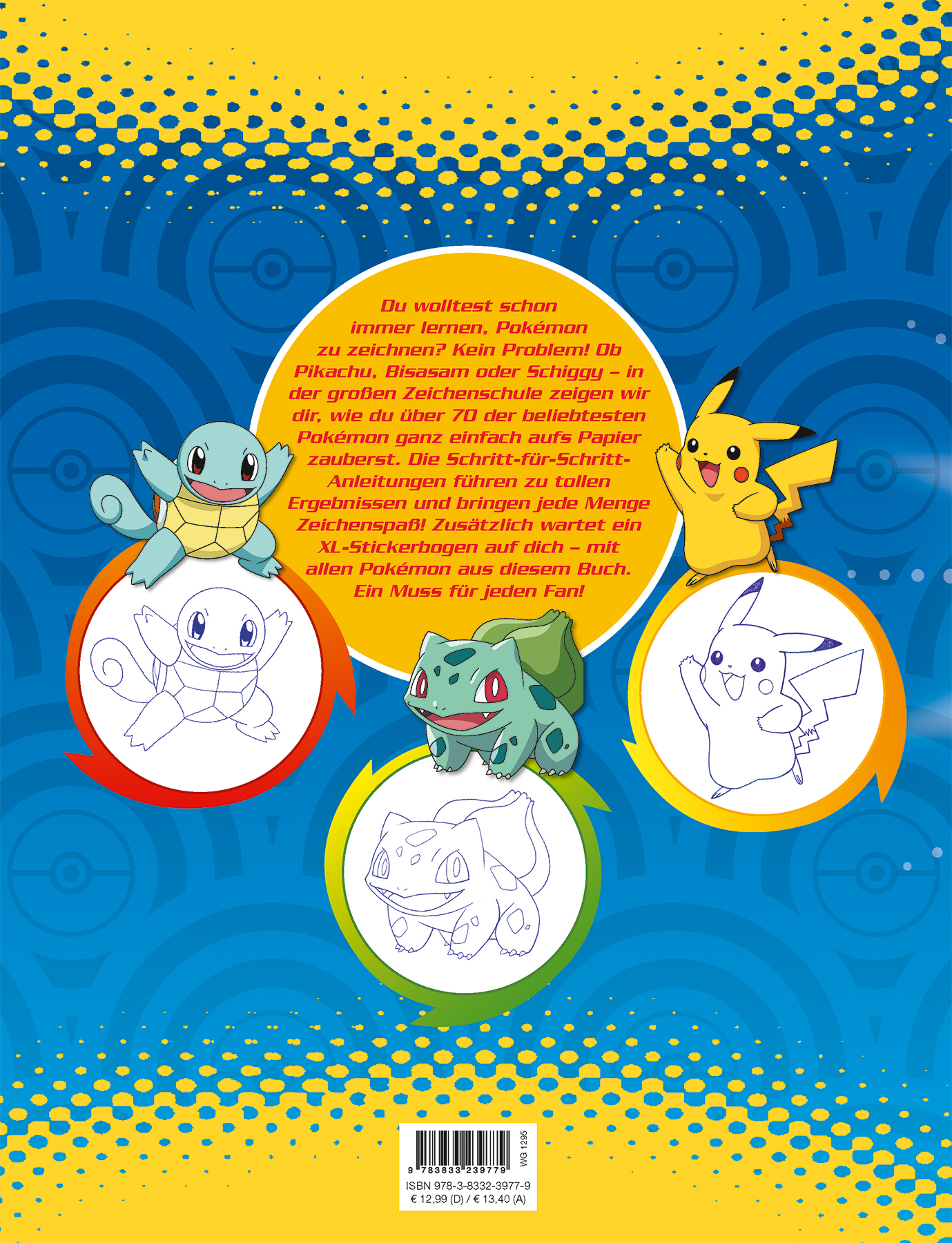 Du wolltest schon immer lernen, Pokémon zu zeichnen? Kein Problem! Ob Pikachu, Bisasam oder Schiggy - in der großen Zeichenschule zeigen wir dir, wie du über 70 der beliebtesten Pokémon ganz einfach aufs Papier zauberst. Die Schritt-für-Schritt- Anleitungen führen zu tollen Ergebnissen und bringen tollen Zeichenspaß! Zusätzlich wartet ein XL-Stickerbogen auf dich - mit allen Pokémon aus diesem Buch. Ein Muss für jeden Fan!