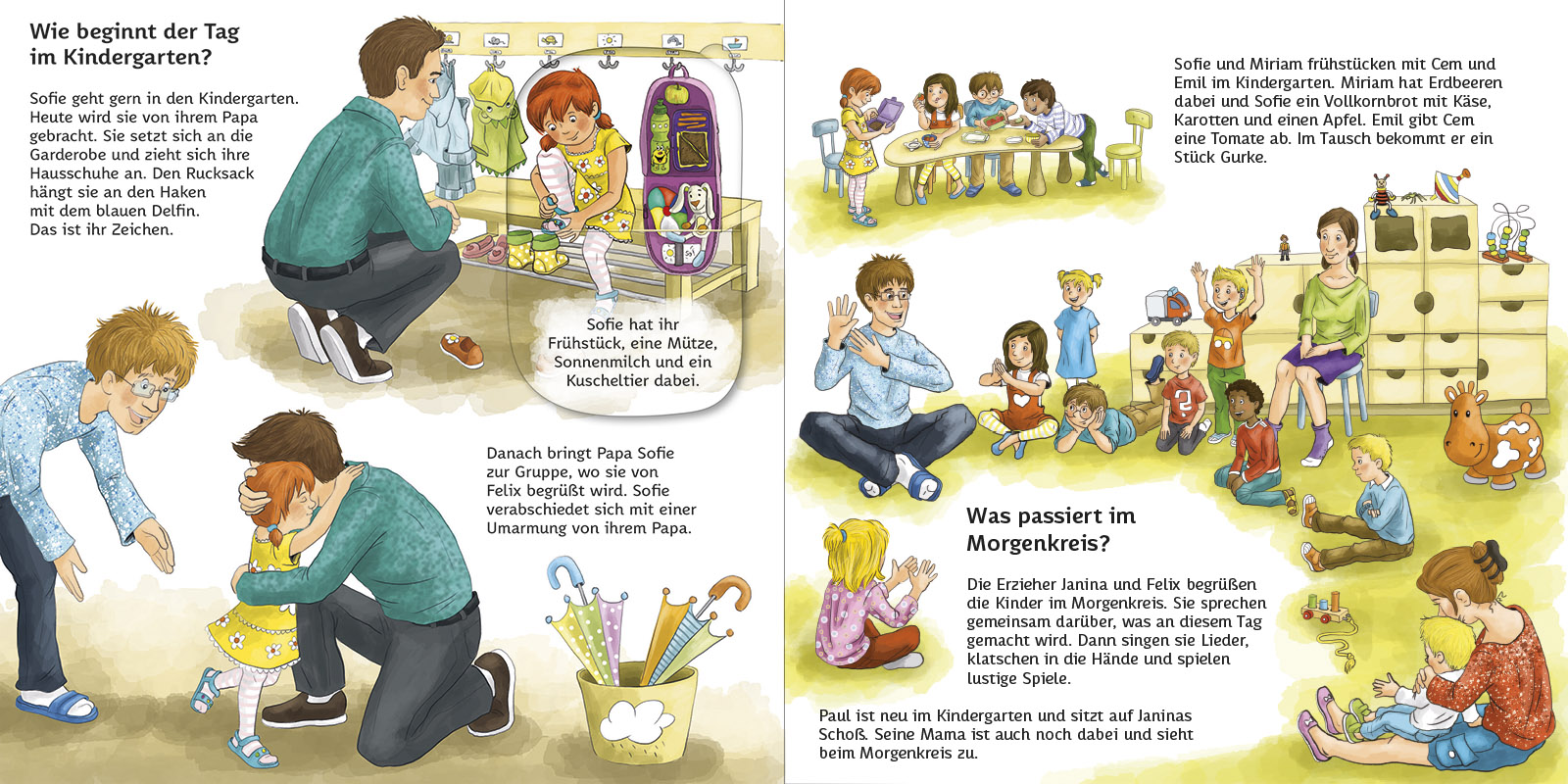 Ein neuer Tag im Kindergarten beginnt! Im Morgenkreis werden alle Kinder begrüßt, und dann wird gespielt. Wer baut eine Ritterburg? Wer tanzt durch den Turnraum und als was verkleidet sich Sophie? Natürlich wird auch gemeinsam zu Mittag gegessen, Mittagsschlaf gehalten, der Spielplatz besucht und vieles mehr. Beim Abholen sind sich alle einig: Das war ein toller Tag!