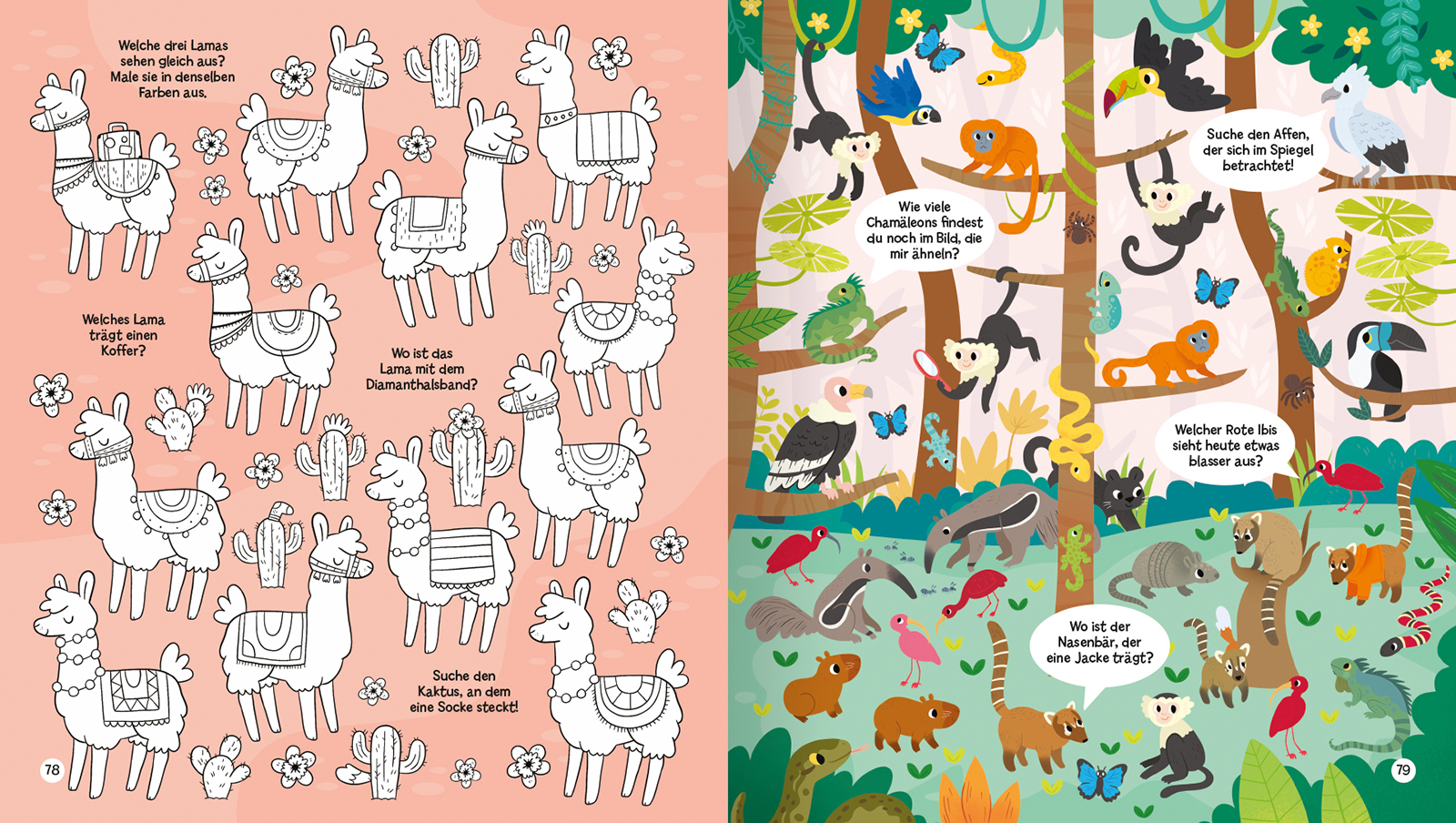 Zahlreiche bunte Suchbilder mit Suchaufträgen und Tiermotive zum Ausmalen