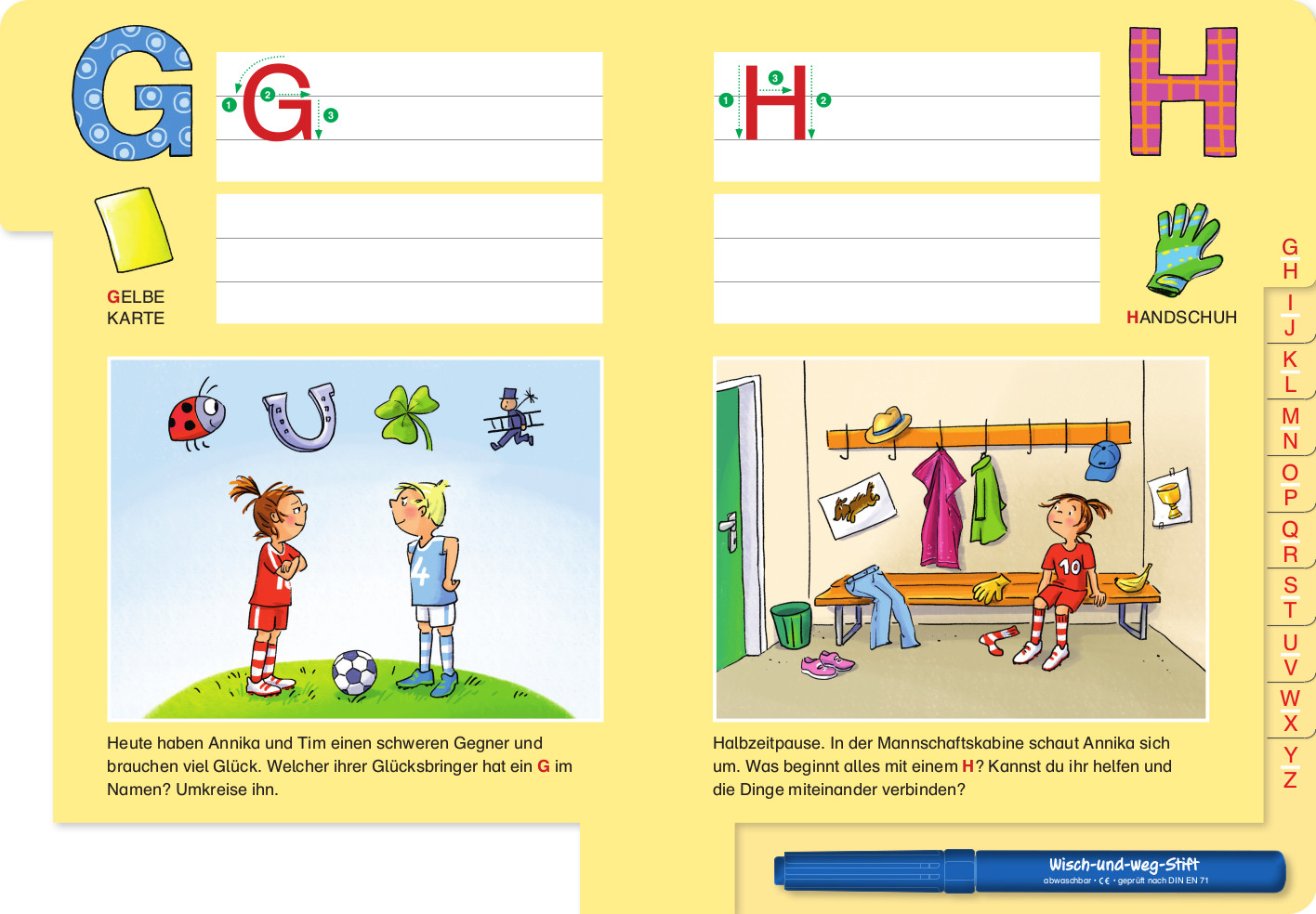 Zusammen mit Annika und Tim können Vorschulkinder das Alphabet entdecken. Ob auf dem Fußballplatz, im Stadion oder bei der Siegerfeier - die Geschwister haben sich für jeden Buchstaben von A bis Z eine fußballstarke Aufgabe ausgedacht.