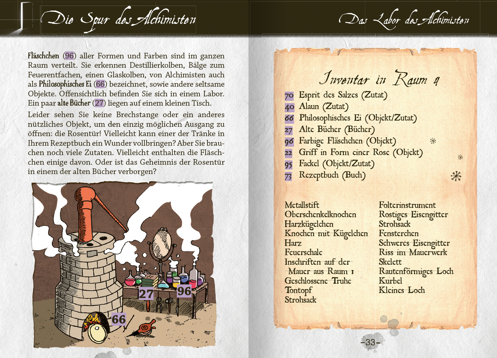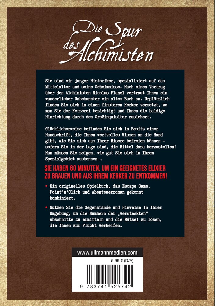 Sie sind ein junger Historiker, spezialisiert auf das Mittelalter und seine Geheimnisse. Nach einem Vortrag über den Alchimisten Nicolas Flamel vertraut Ihnen ein wunderlicher Unbekannter ein altes Buch an. Urplötzlich finden Sie sich in einen finsteren Kerker versetzt, wo man Sie der Ketzerei bezichtigt und Ihnen Ihre baldige Hinrichtung durch den Großinquisitor zusichert. Glücklicherweise befinden Sie sich in Besitz einer wertvollen alchimistischen Handschrift, die Ihnen wertvolle Mittel an die Hand gibt, wie Sie sich aus Ihrer Misere befreien können - wenn Sie in der Lage sind, diese herzustellen! Nun müssen Sie zeigen, wie gut Sie sich in Ihrem Spezialgebiet auskennen ...Der Leser hat den Handlungsablauf selbst in der Hand und kann sich selbst immer wieder auf die Probe stellen, ob er es schafft, das Spielziel binnen 60 Minuten zu erreichen.