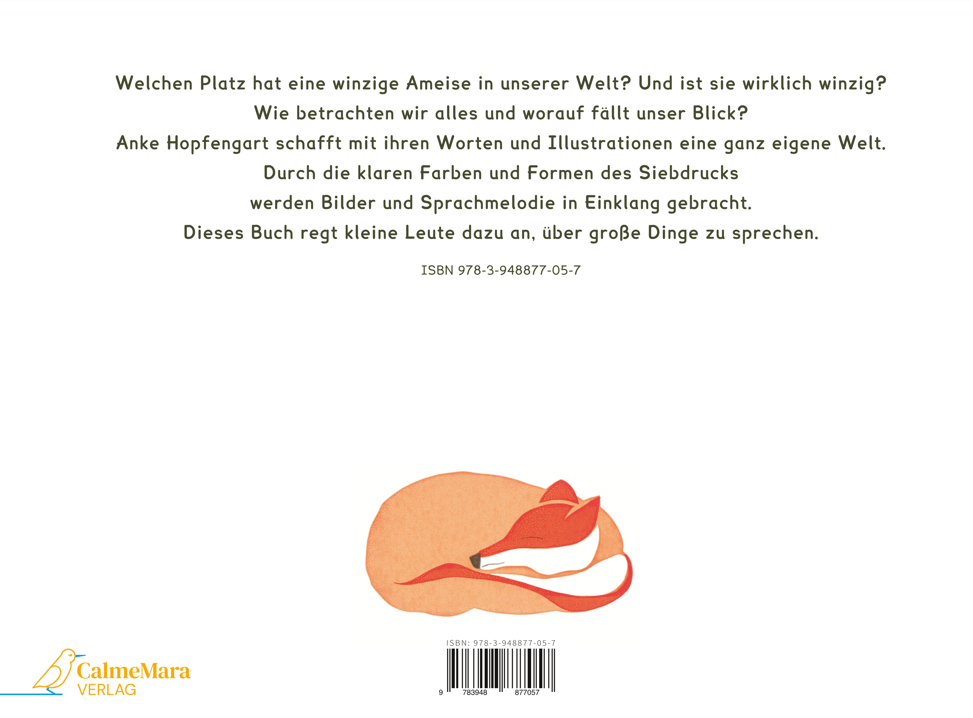 Welchen Platz hat eine winzige Ameise in unserer Welt? Und ist sie wirklich winzig? Wie betrachten wir alles und worauf fällt unser Blick? Anke Hopfengart schafft mit ihren Worten und Illustrationen eine ganz eigene Welt. Durch die klaren Farben und Formen des Siebdrucks werden Bilder und Sprachmelodie in Einklang gebracht. Dieses Buch regt kleine Leute dazu an, über große Dinge zu sprechen.