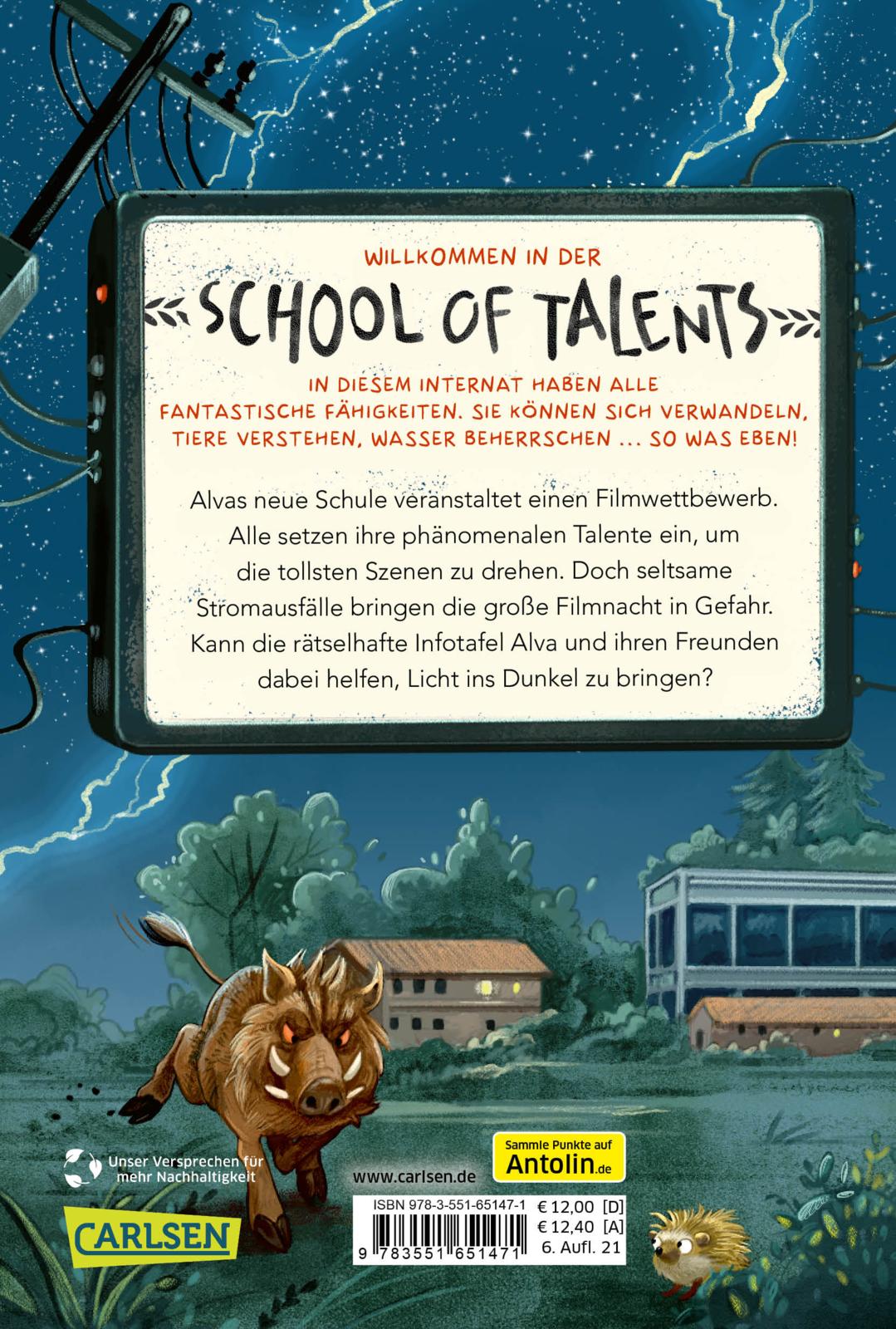 Band 2: Filmfieber in der SCHOOL OF TALENTS! Das Internat veranstaltet einen Filmwettbewerb und alle setzen ihre phänomenalen Talente ein, um die tollsten Szenen zu drehen. Alvas Freund Jonas will unbedingt gewinnen. Doch seltsame Stromausfälle bringen den großen Premieren-Abend in Gefahr. Wer steckt dahinter? Und kann die geheimnisvolle Anzeigetafel den Freunden dabei helfen, Licht ins Dunkel zu bringen?
