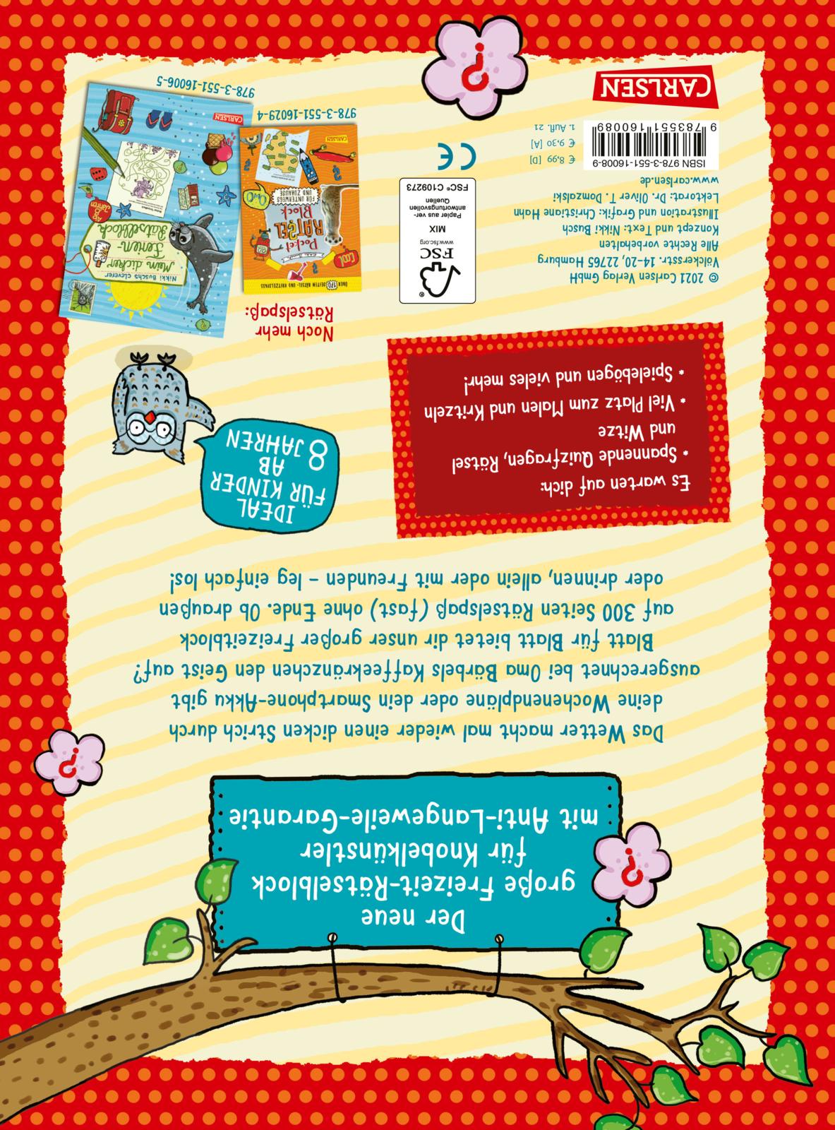 Blatt für Blatt bietet dieser großformatige Freizeitblock Rätselspaß (fast) ohne Ende. Über 300 Seiten laden zum Rätseln, Knobeln, Malen und Lachen ein - ob Draußen oder Drinnen, allein oder mit Freunden. Mit einem Stift als Hilfmittel kann es losgehen. Der Block beinhaltet: Kreuzworträtsel, Mal- und Weitermalaufgaben, Zuordnungsrätsel, Sudokus, Rechen- und Logikrätsel, Scherzfragen und vieles mehr.