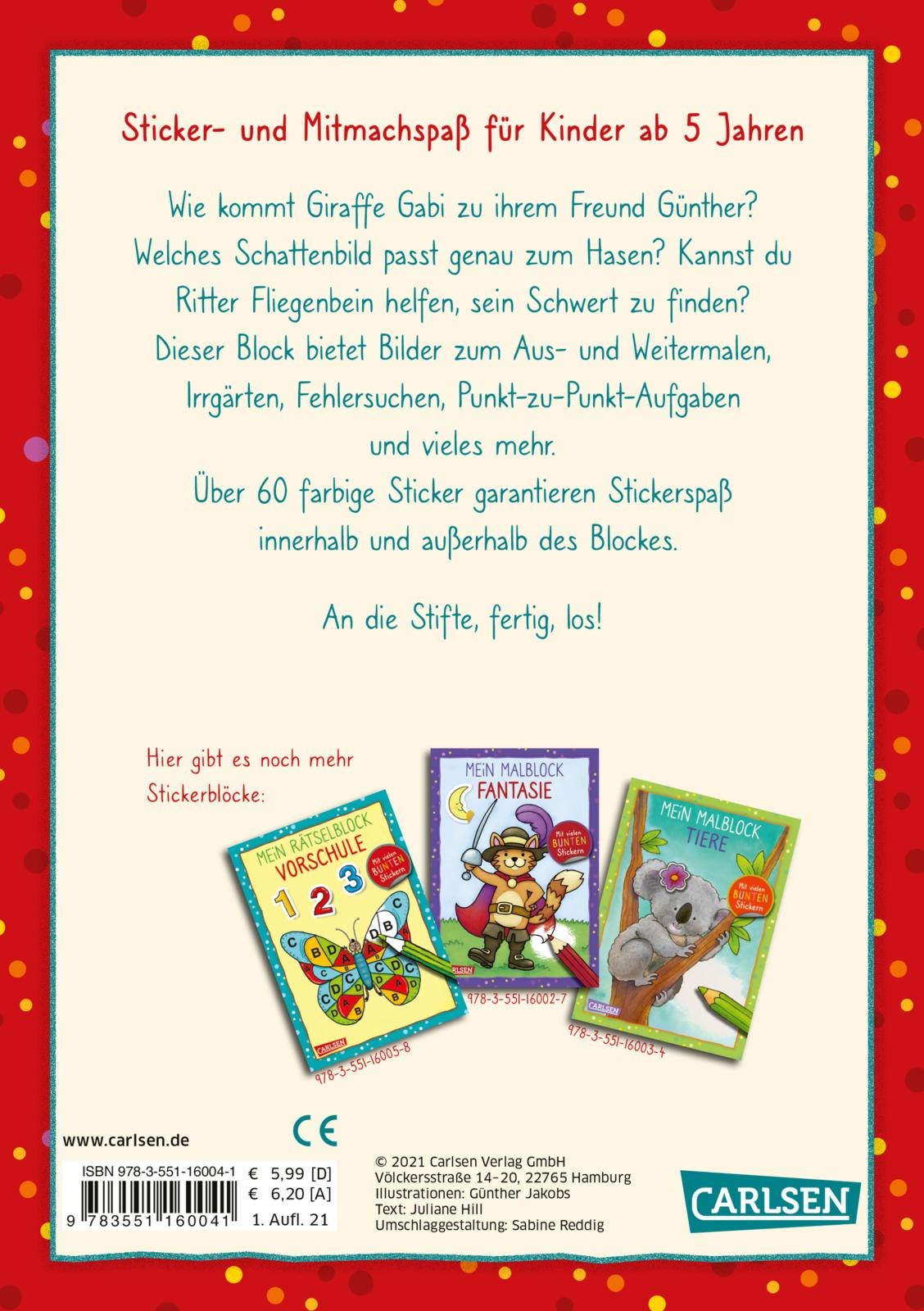 Dieser Block bietet Kindern Bilder zum Aus- und Weitermalen, Irrgärten, Fehlersuchen, Punkt-zu-Punkt-Aufgaben und vieles mehr. Ob Ritter und Prinzessinnen, Tiere oder Fahrzeuge - alle Aufgaben finden sich in verschiedenen Settings liebevoll eingebettet. Über 60 farbige Sticker garantieren Stickerspaß innerhalb und außerhalb des Blockes. Raus die Stifte, fertig, los!