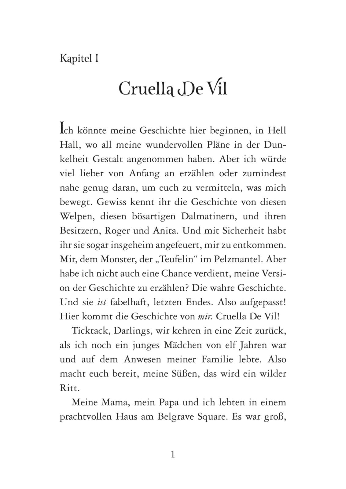 Selbst die grausamsten Bösewichter kennen wahre Freundschaft, große Liebe und wagemutige Träume. So auch Cruella, die nun an der Reihe ist, ihre Geschichte zu erzählen. Sie handelt von einer einsamen Kindheit, aufsehenerregenden Outfits, einem fatalen Autounfall und von einer Frau, deren Leben dem Untergang geweiht ist. Es ist eine Geschichte über das schwierige Band weiblicher Freundschaft, über Mütter und Töchter und über brennendes, zerstörerisches Verlangen.