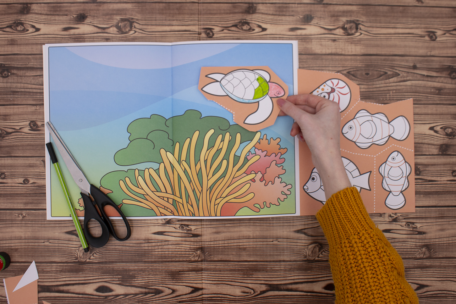 Basteln ist doch kinderleicht! Zuerst wird die perforierte Ausklappseite abgetrennt und dann werden die Motive ausgemalt. Danach dürfen kleine Bastler die Motive entlang der extradicken Umrisslinien ausschneiden und in die Unterwasserszene einkleben. Die fertigen Bilder auf der Lösungsseite können hierbei eine Hilfe sein.