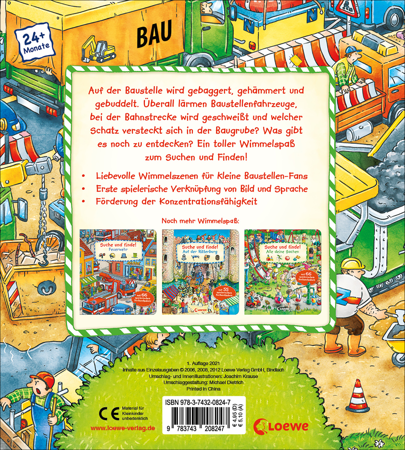 | Schlagworte | Bagger Bauarbeiter Kran Kipplader große Maschinen • Bilderbuch Bilderbücher ab 2 Jahren Jährige 24 Monate • Bilder suchen finden Konzentration Aufmerksamkeit • Geschenk unter 10 Euro Kleinkinder Weihnachten Geburtstag • Kleinkind Kleinkinder Kinder Welt Natur entdecken • Pappbilderbücher ab 2 zwei Jahren Jährige • Suchbilder Wimmelbilder für Kleinkinder • Suchen und entdecken ab zwei 2 Jahre • Wimmelbilder auf der Baustelle • Wimmelbuch Wimmelbilder ab 2 Jahren 24 Monaten |