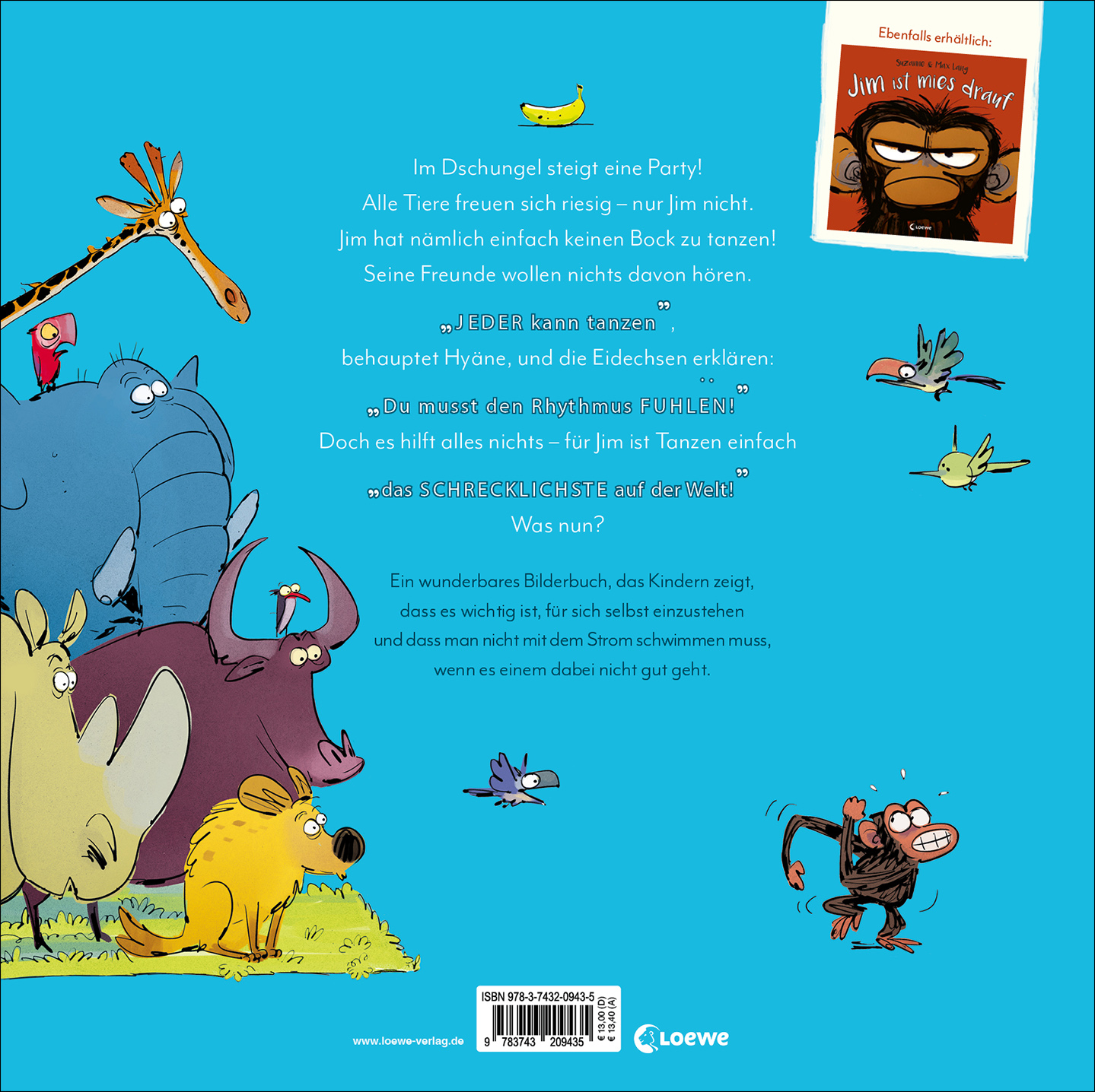 Es ist nicht immer einfach, zu seinen Gefühlen zu stehen - besonders, wenn scheinbar alle Freunde etwas besonders toll finden, nur man selbst nicht. Doch das bedeutet nicht, dass man automatisch nicht mitmachen kann, oder dass man deshalb anderen den Spaß verdirbt. Das lernt auch Affe Jim in diesem witzigen und einfühlsamen Bilderbuch für Kinder ab 4 Jahren. Kindgerecht und lustig wird der Umgang mit schwer erklärbaren Gefühlen thematisiert und gezeigt, dass Nein sagen völlig in Ordnung ist. Der Nachfolgeband zum erfolgreichen Bilderbuch Jim ist mies drauf.