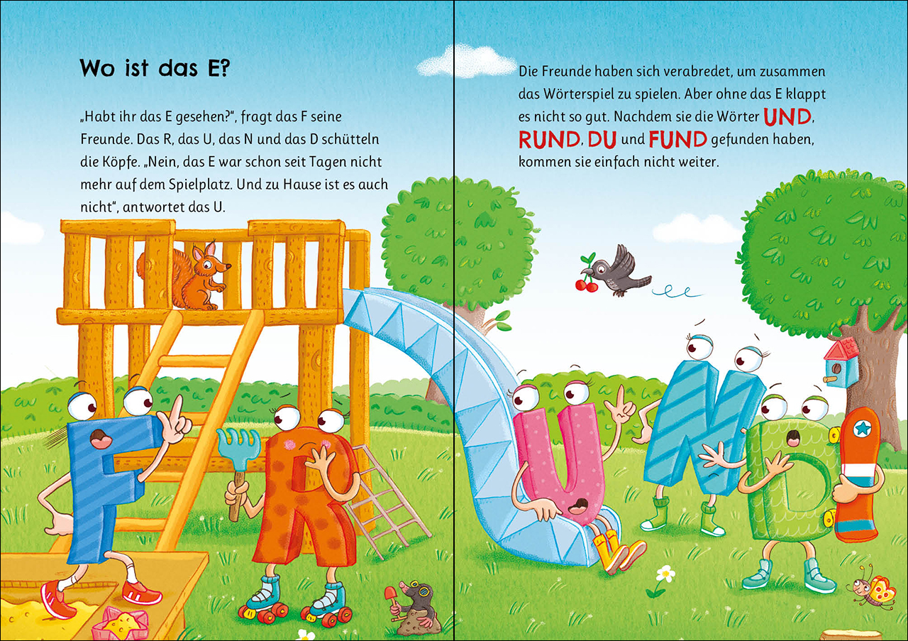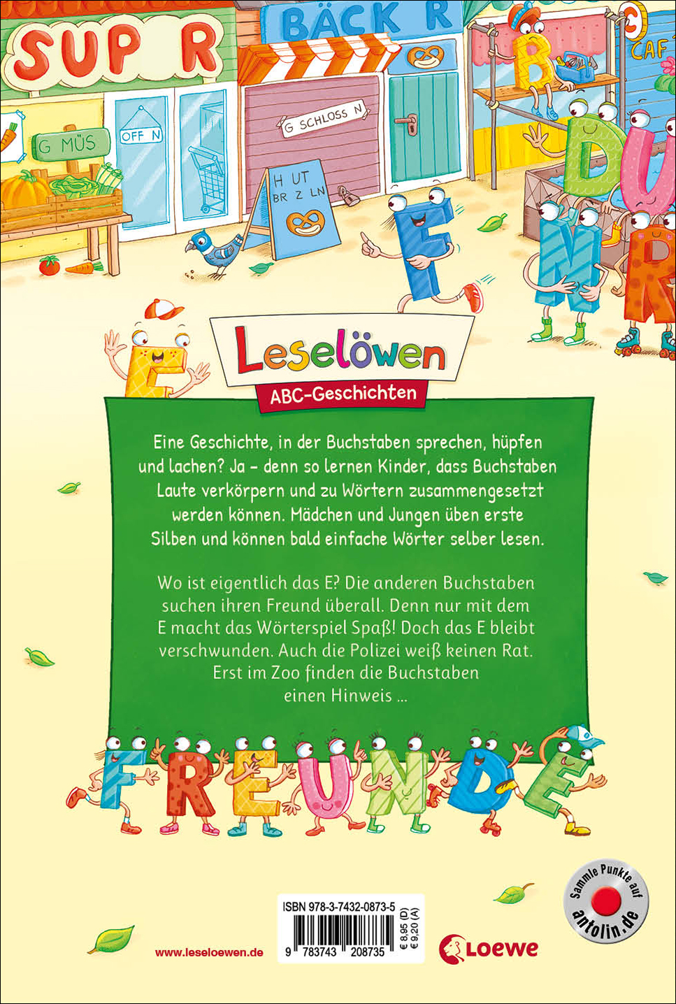 Wo ist eigentlich das E? Die anderen Buchstaben suchen ihren Freund überall. Denn nur mit dem E macht das Wörterspiel Spaß! Doch das E bleibt verschwunden. Auch die Polizei weiß keinen Rat. Erst im Zoo finden die Buchstaben einen Hinweis ...
