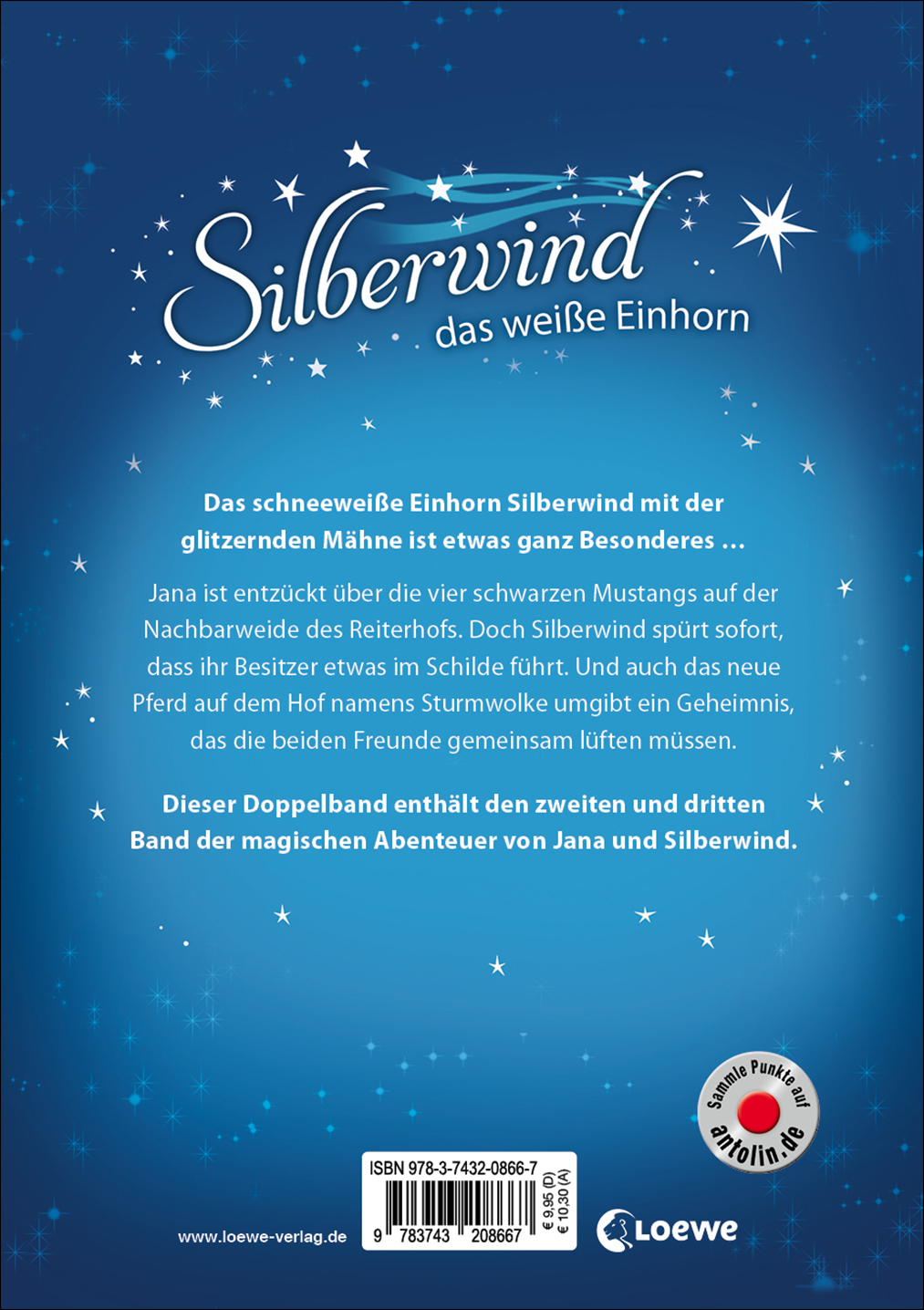 Jana spürt sofort, dass es mit Silberwind etwas ganz Besonderes auf sich hat. Als das schneeweiße Pferd mit der glitzernden Mähne und dem Fleck auf der Stirn dann mit Jana spricht und sie in seine Geheimnisse einweiht, erkennt Jana: Silberwind ist ein Einhorn. Nur Jana kann sein silbernes Horn auf der Stirn sehen und auch nur sie kann mit dem Einhorn sprechen. Gemeinsam mit ihrem Freund Jörgo erleben Silberwind und Jana wunderbare Abenteuer. Dieser Doppelband enthält zwei Bände von Silberwind, das weiße Einhorn: Band 3: Die vier Wildpferde Band 4: Sturmwolkes Geheimnis